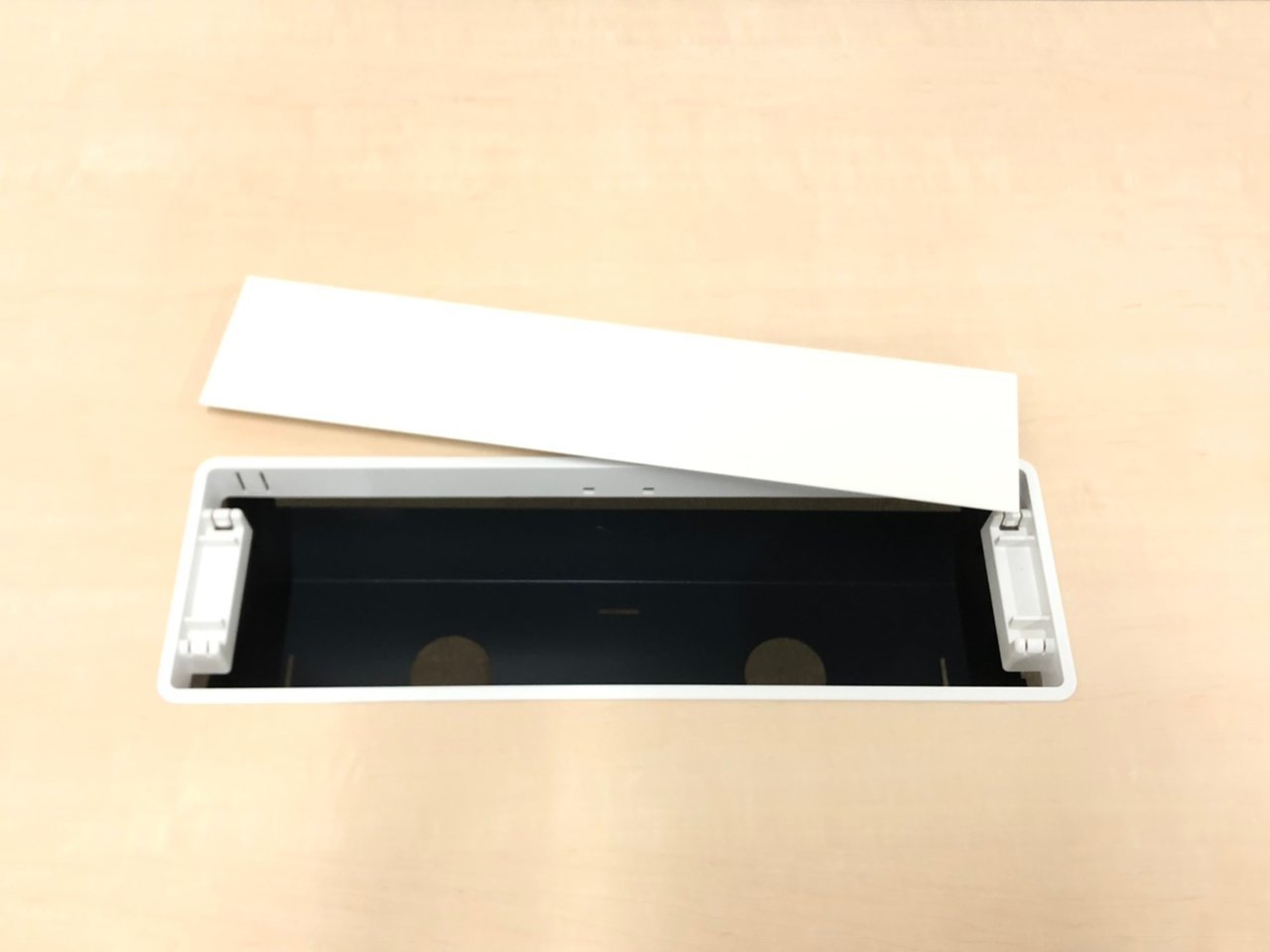 スタンダードなデザインながら、配線取り出し口が付いており、