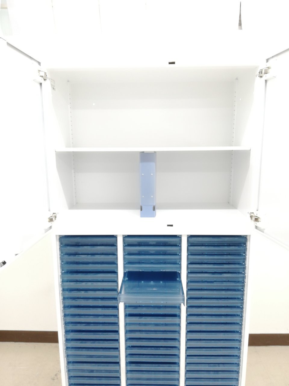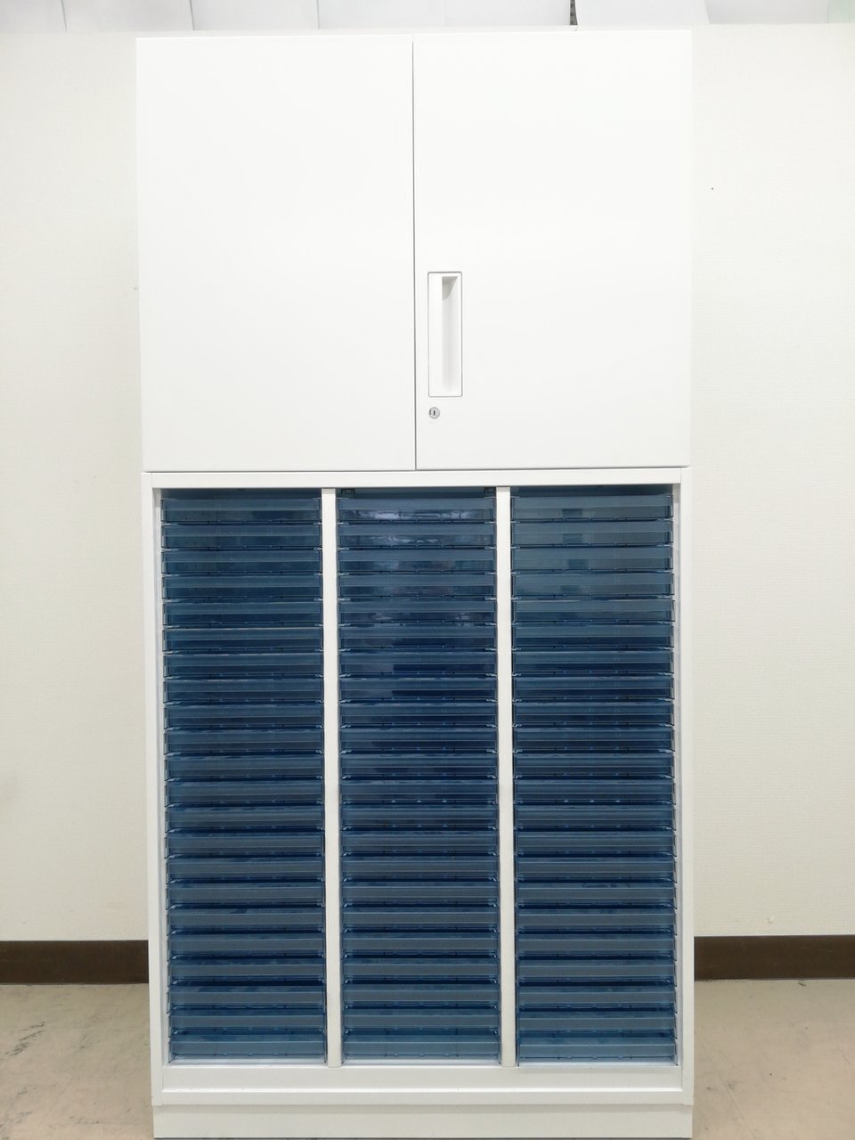 下段のトレイ書庫は縦22段、横3列の総数66個タイプで、分別に便利な優良品です。