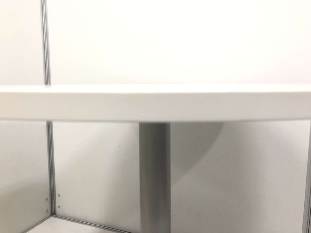 - 一部不具合あり天板歪み、アジャスター無し、キャスター使用不可ようなそのテーブルの本来の効用を果たすための機能以外の一部が使用不可な状態。(例、キャスターロッ ク機能使用不可、棚板無し等がある。)