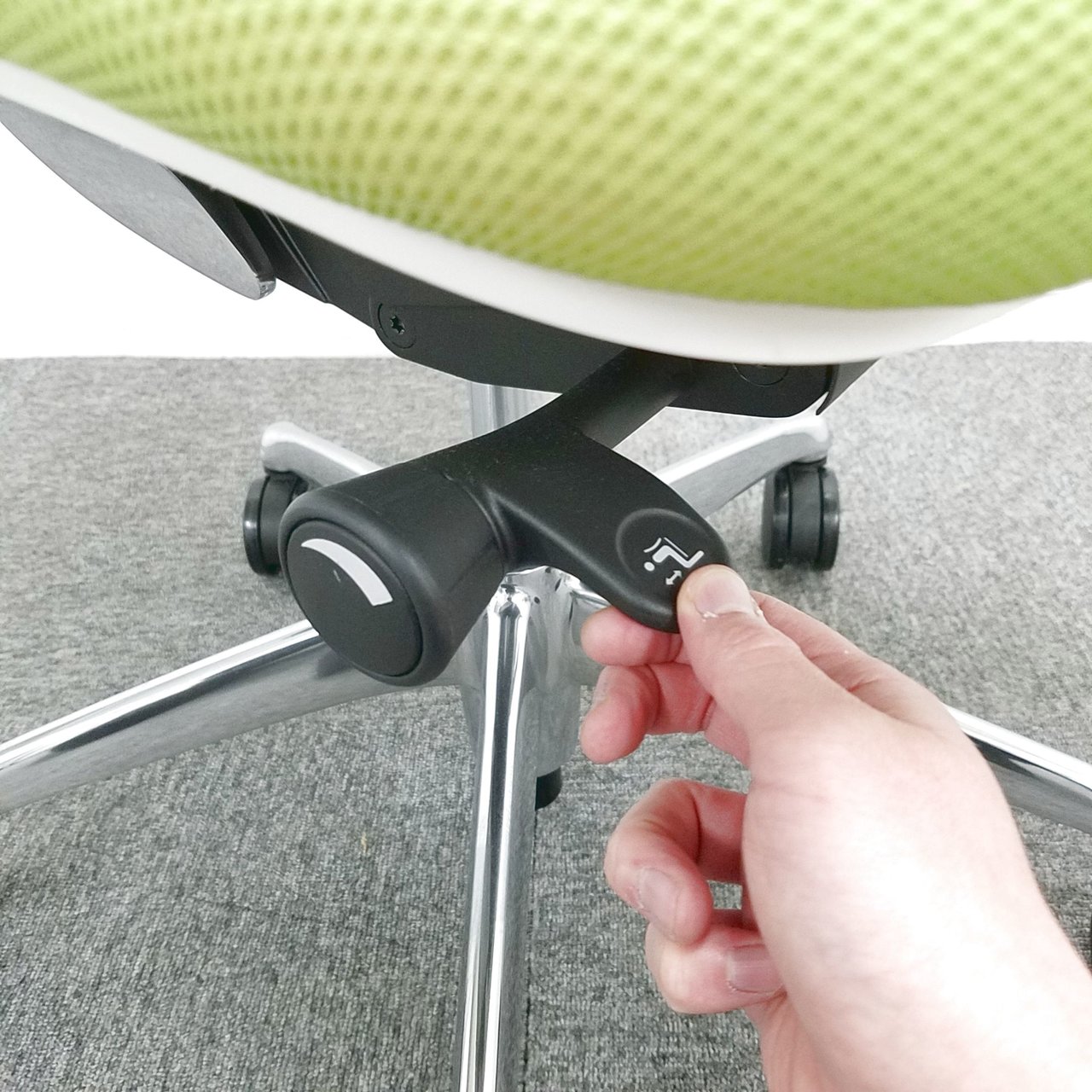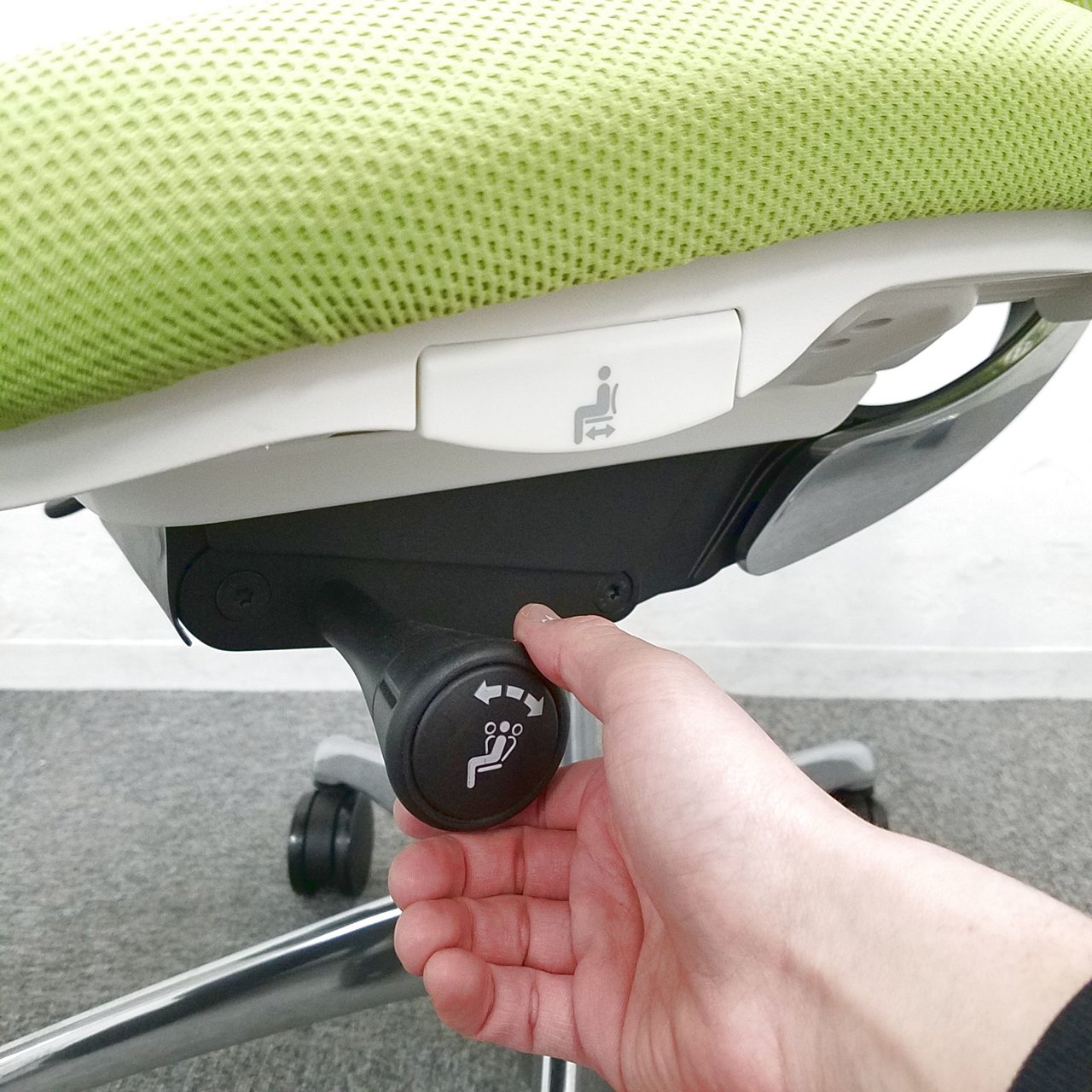 - 座面右下のレバーをスライドさせる「クイックスライドオペレーション」で、リクライニング反力を調整できます。強さの状態が視覚的にわかるため、直感的に操作がおこなえます。