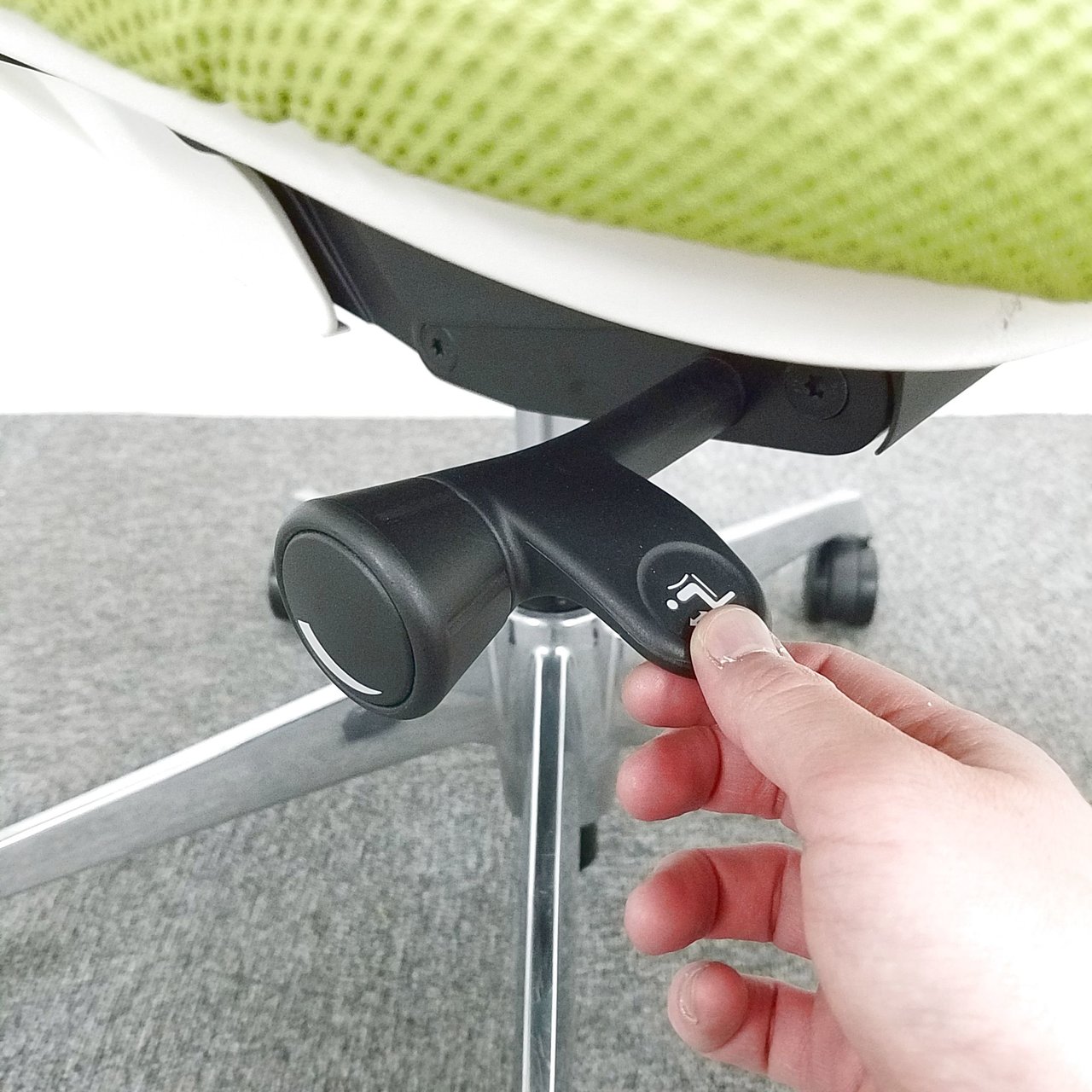 - 座面右下のダイヤル操作で、リクライニングの強弱調整が行えます。これまでのダイヤル式よりも、少ない回転数で、最弱?最強の調整が可能です。