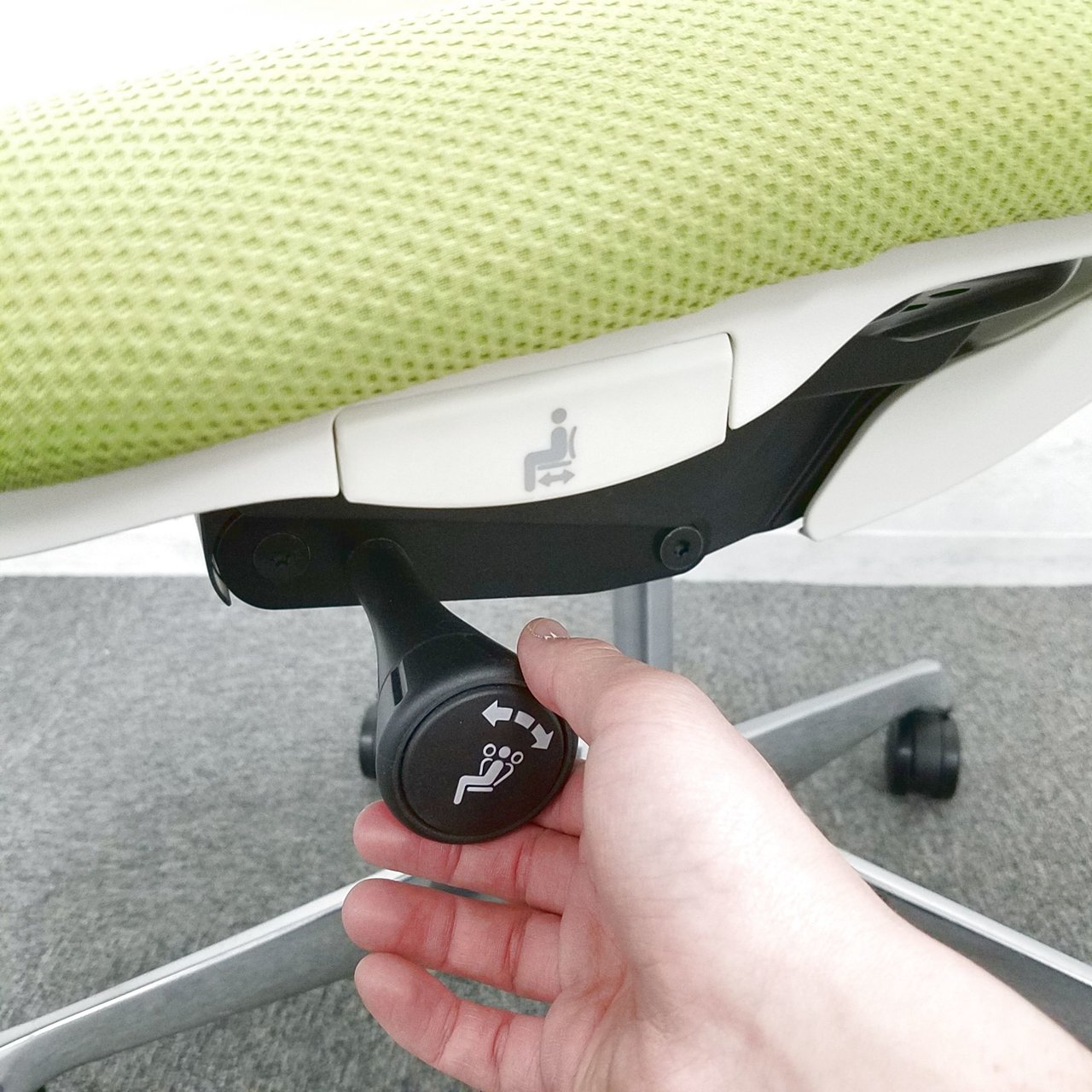 - 座面の左にあるレバー操作により、座面の奥行き調整が可能です。(ストローク:50mm)