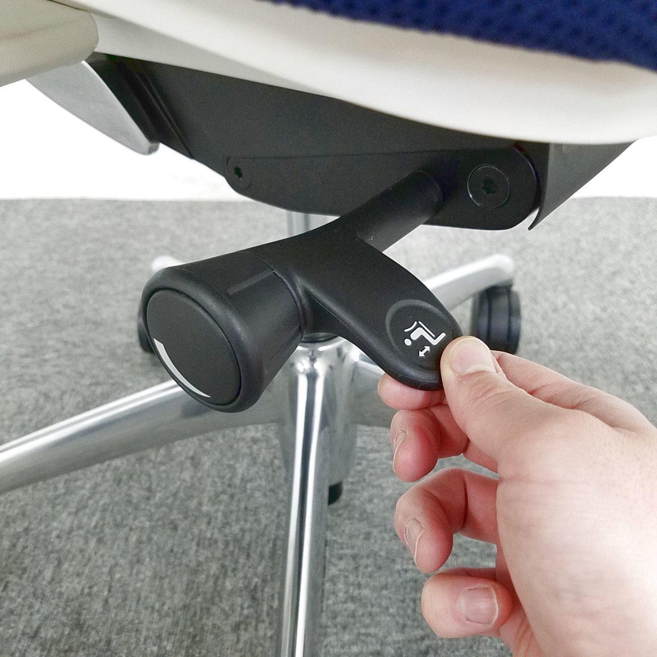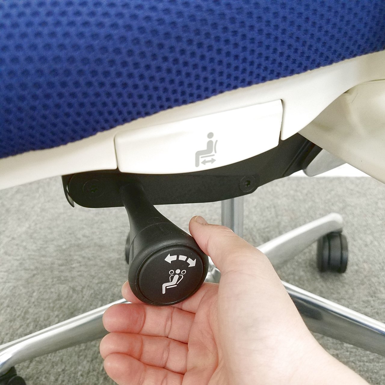- 座面右下のレバーをスライドさせる「クイックスライドオペレーション」で、リクライニング反力を調整できます。強さの状態が視覚的にわかるため、直感的に操作がおこなえます。