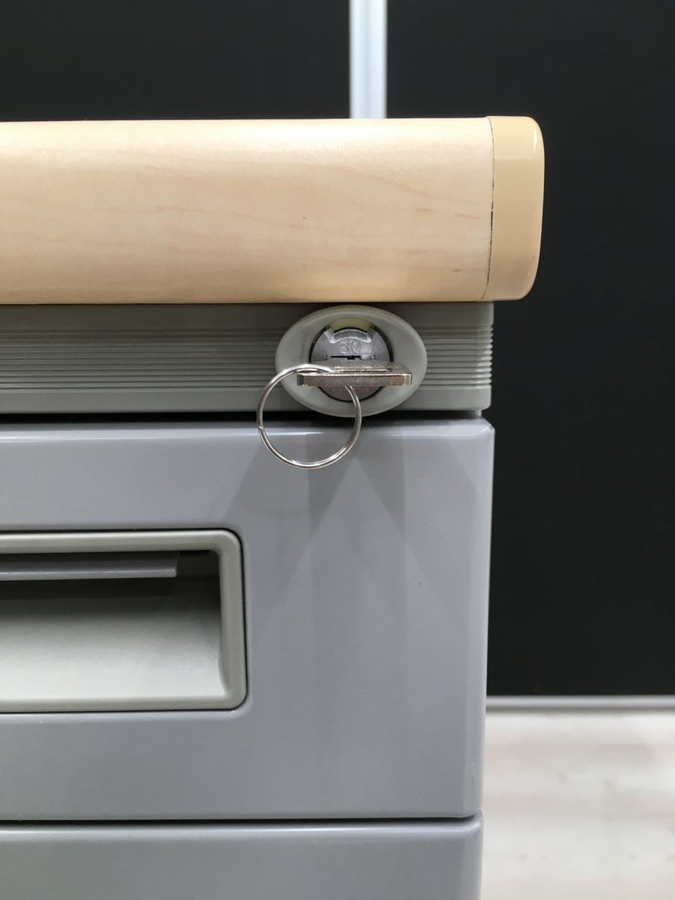 - シンプルながらも使いやすい工夫があります。ロックは、一度の施錠ですべての引出しの鍵がかかるオールロック機構。