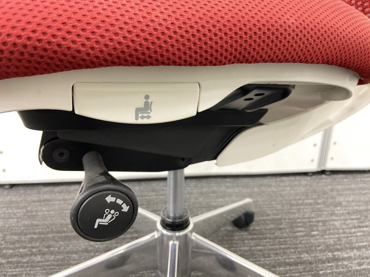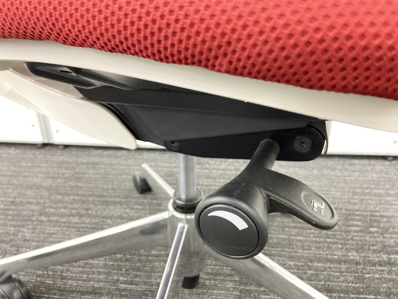 - 座面右下のダイヤル操作で、リクライニングの強弱調整が行えます。これまでのダイヤル式よりも、少ない回転数で、最弱?最強の調整が可能です。