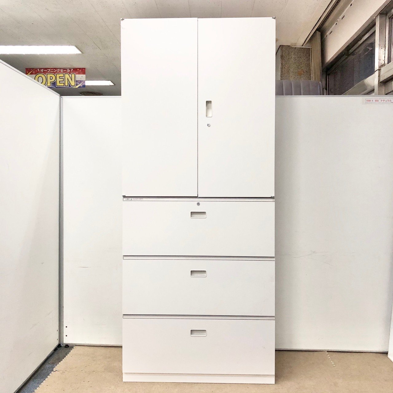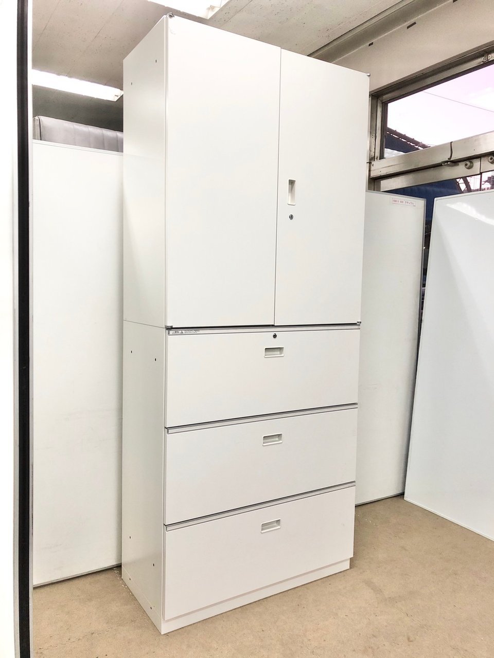 - 一部不具合ありそ引出の開閉不可、施錠不可、棚板無しといったの書庫の本来の効用を果たすための機能以外の一部が使用不可(例、扉、引出の開閉がしづらいなどがある。 )