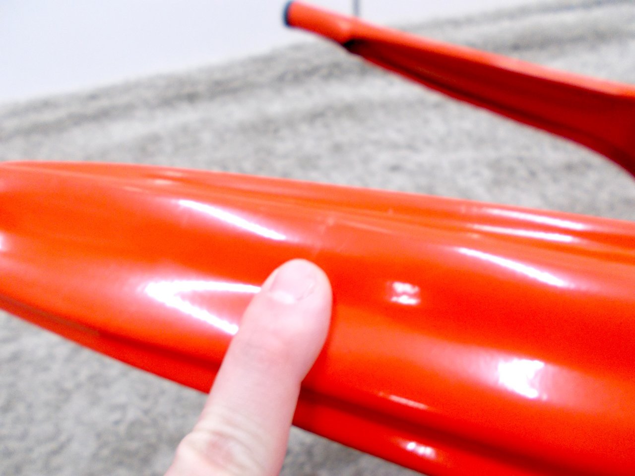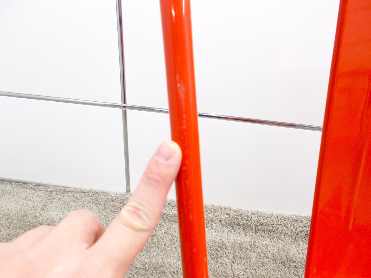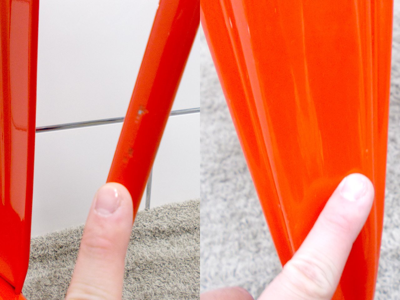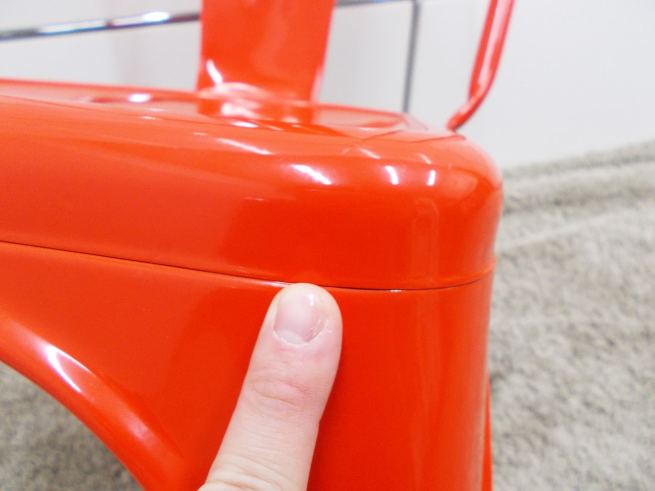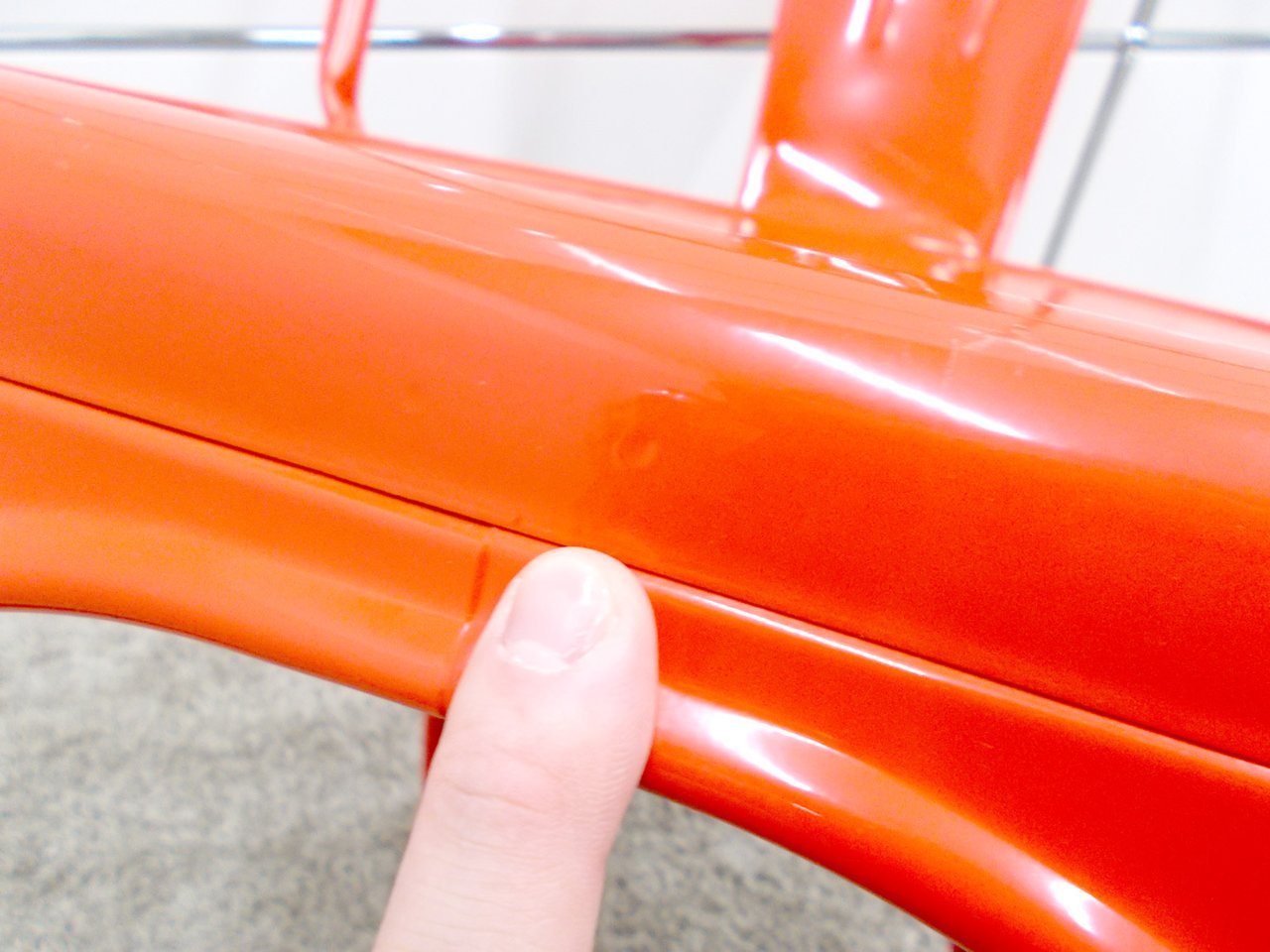 - かなり強い濃い黄ばみ・変色が商品全体にある。(例、座面・背もたれ、脚部等にある。)