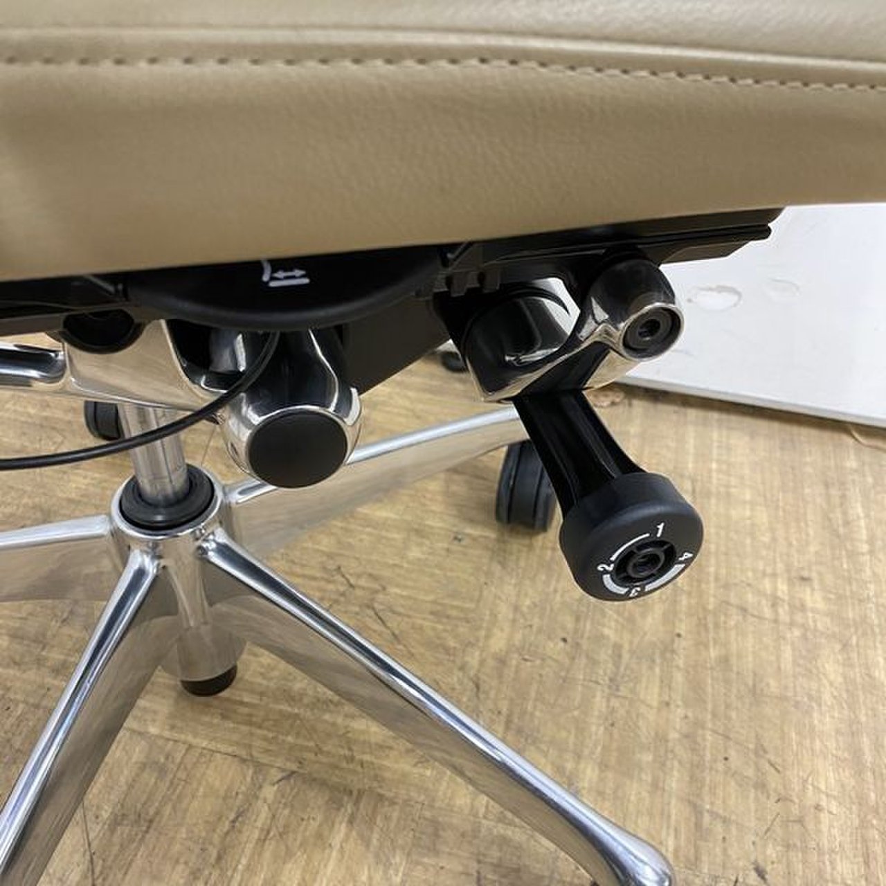 - ロッキングの強弱を調整するダイヤルがございます。体型に合わせてリクライニングの固さを座ったままで調整できます。