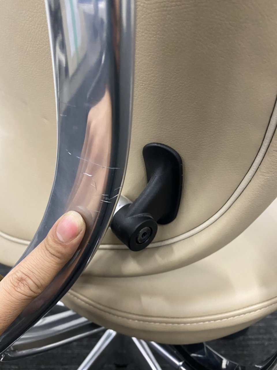 - かなり強い濃い黄ばみ・変色が商品全体にある。(例、座面・背もたれ、脚部等にある。)