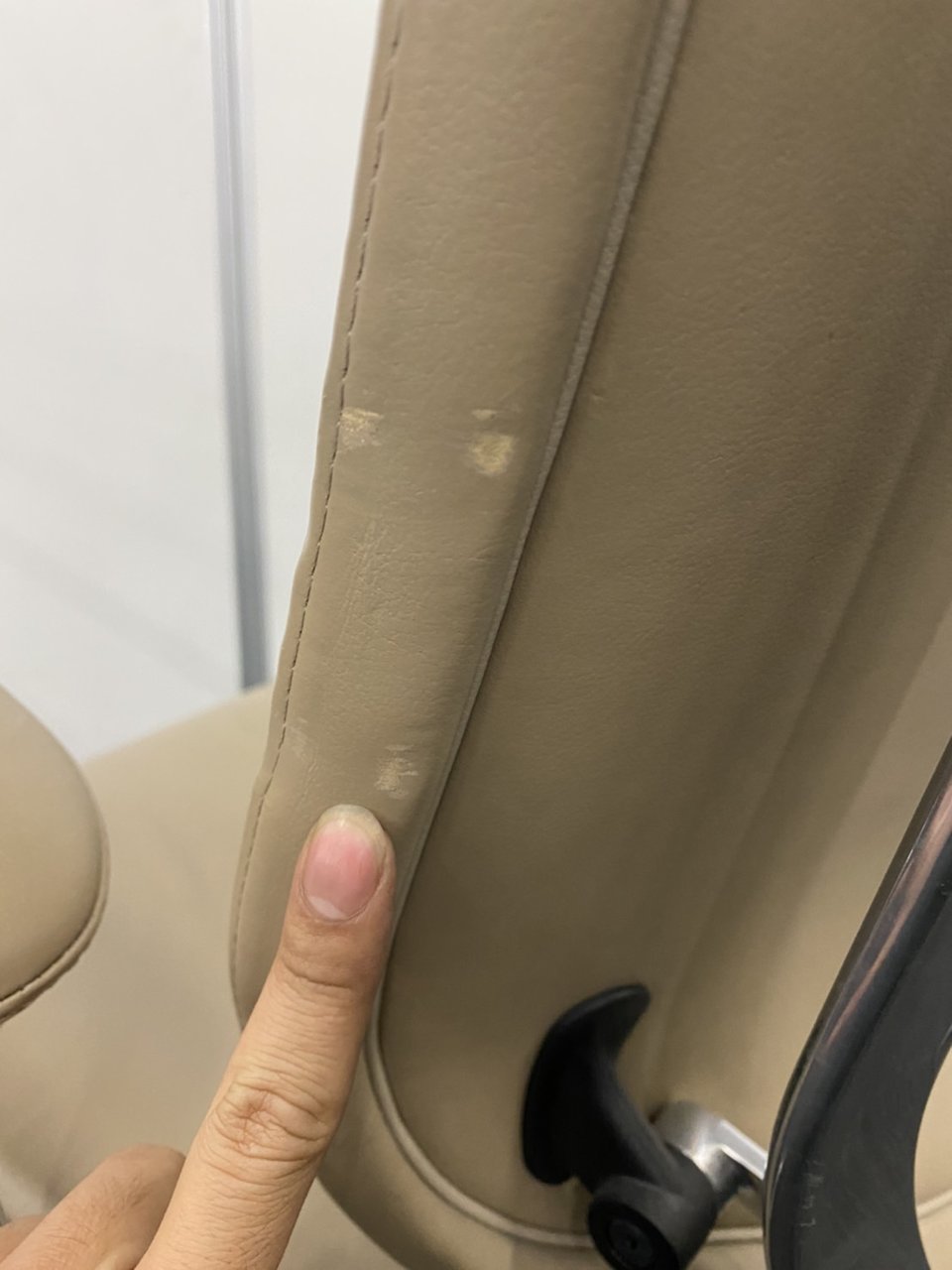 - あり黄ばみ・変色が広い範囲にうっすらある、または濃い黄ばみ・変色が一部ある。(例、座面・背もたれ、脚部等にある。)