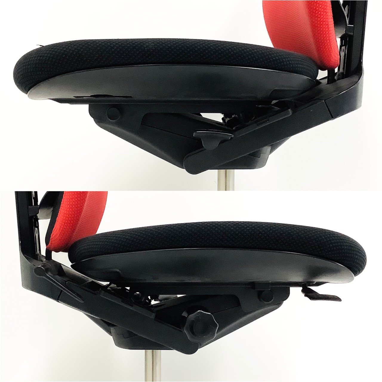 例えば、座面は、イトーキ独自の"ベンディングシート"という機構により、クッション、インターシェル、空洞という三層構造になっています。 この真ん中に挟まっているインナーシェルが、着座時の姿勢に合わせて体重を分散してくれるので、どんな姿勢でも体になじみ、疲労を軽減してくれます。 さらに、座面は前後に4センチほど奥行きを調整でき、前傾姿勢で座りたい、深く腰掛けたい、膝裏を圧迫されたくないなど、個人の好みに合った快適さにカスタマイズが可能となっています。
