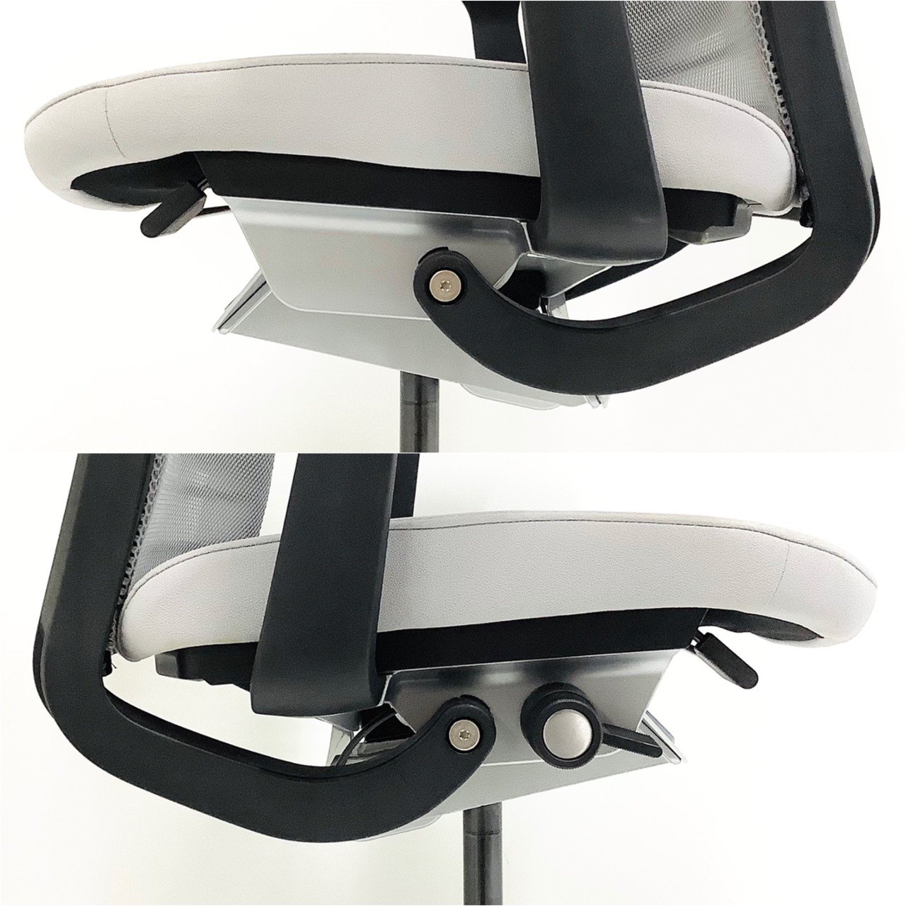 - レバーを引き上げながら座面を前後にスライドさせ、レバーを放すとロックします。背もたれに身体をつけた状態で膝の裏側と座面のエッジの間に5-8センチほどの隙間ができるのが理想的です。