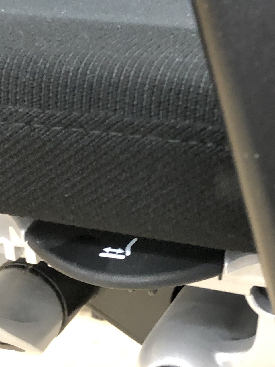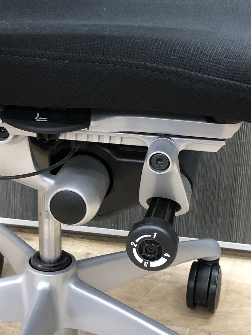 - ロッキングの強弱を調整するダイヤルがございます。体型に合わせてリクライニングの固さを座ったままで調整できます。