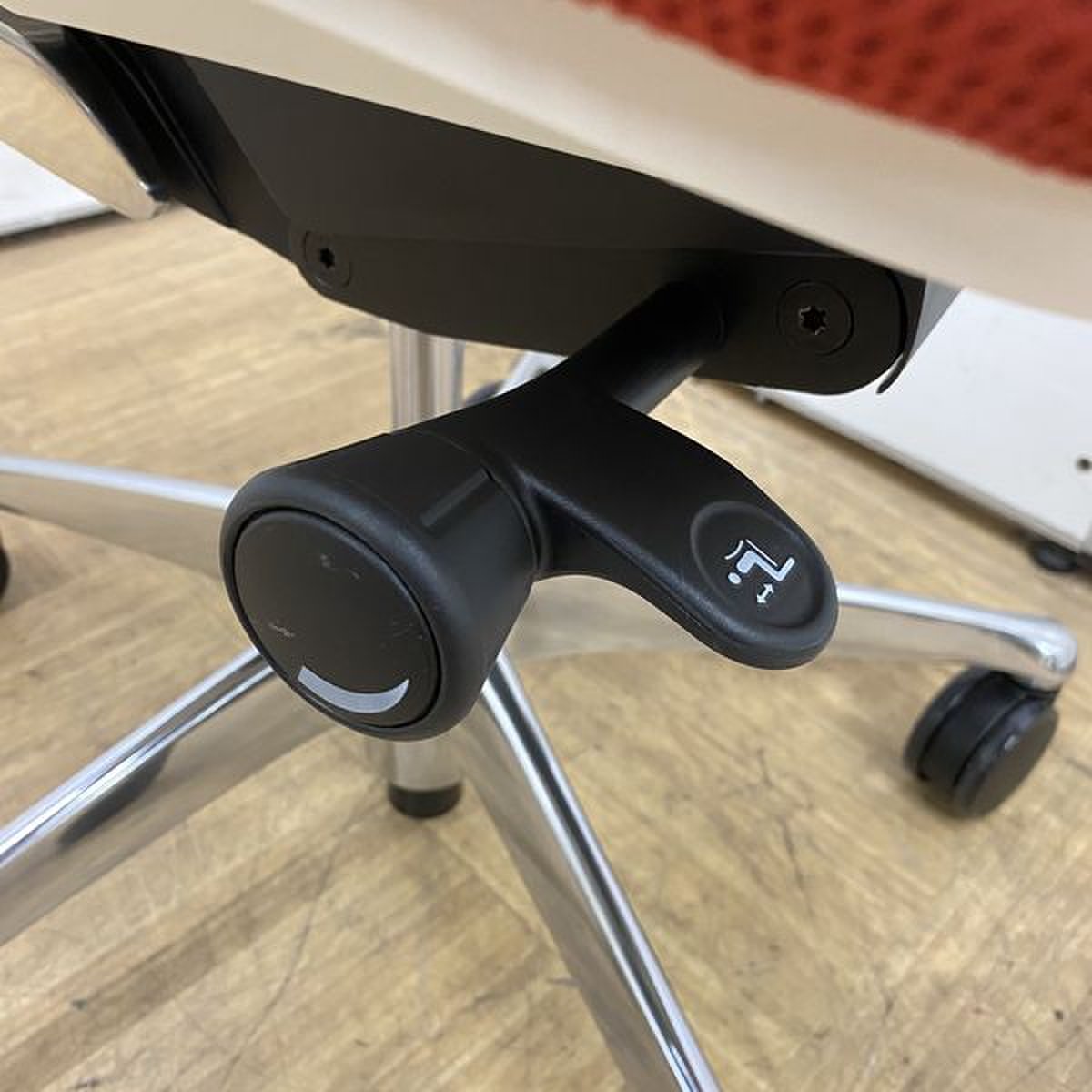 座面右下のレバーを回転させることで、リクライニング反力の強弱を調整できます。