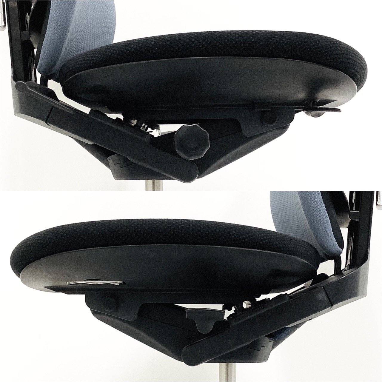 例えば、座面は、イトーキ独自の"ベンディングシート"という機構により、クッション、インターシェル、空洞という三層構造になっています。 この真ん中に挟まっているインナーシェルが、着座時の姿勢に合わせて体重を分散してくれるので、どんな姿勢でも体になじみ、疲労を軽減してくれます。 さらに、座面は前後に4センチほど奥行きを調整でき、前傾姿勢で座りたい、深く腰掛けたい、膝裏を圧迫されたくないなど、個人の好みに合った快適さにカスタマイズが可能となっています。