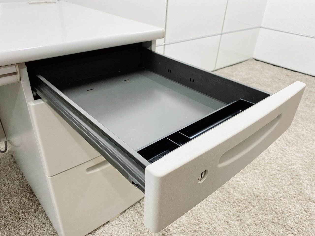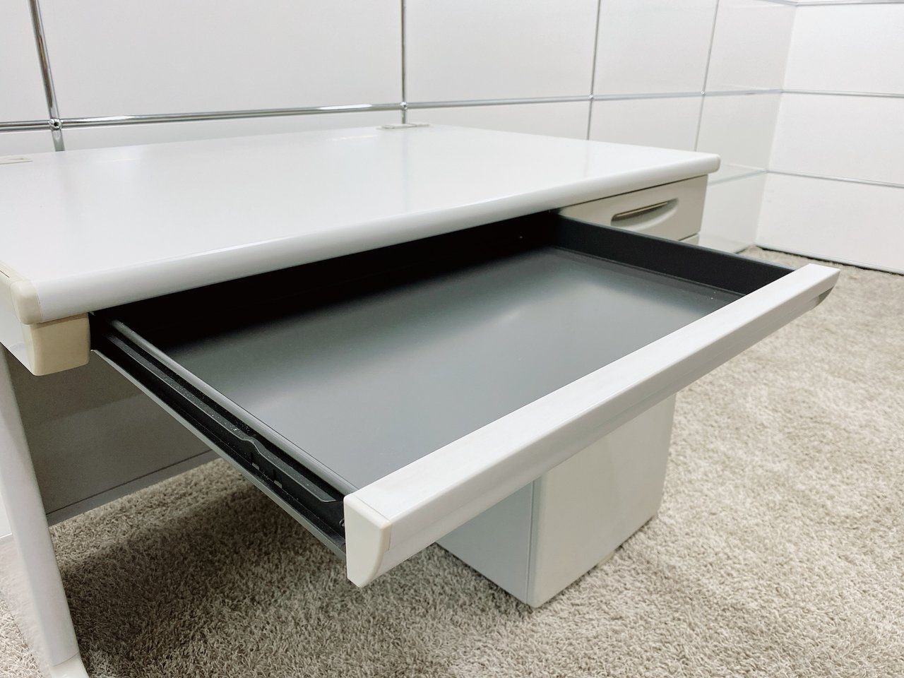 - 袖机のワゴンは、最下段がロング引出しになっており、従来より収納力120%アップ。