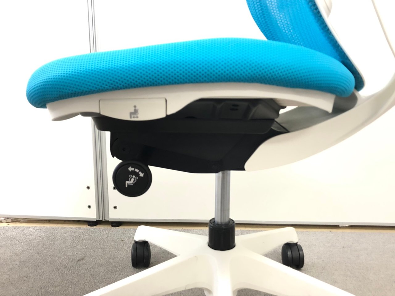 - 座面左下のダイヤルでリクライニングの固定と解除が行えます。 前傾ポジションをとることも可能です。