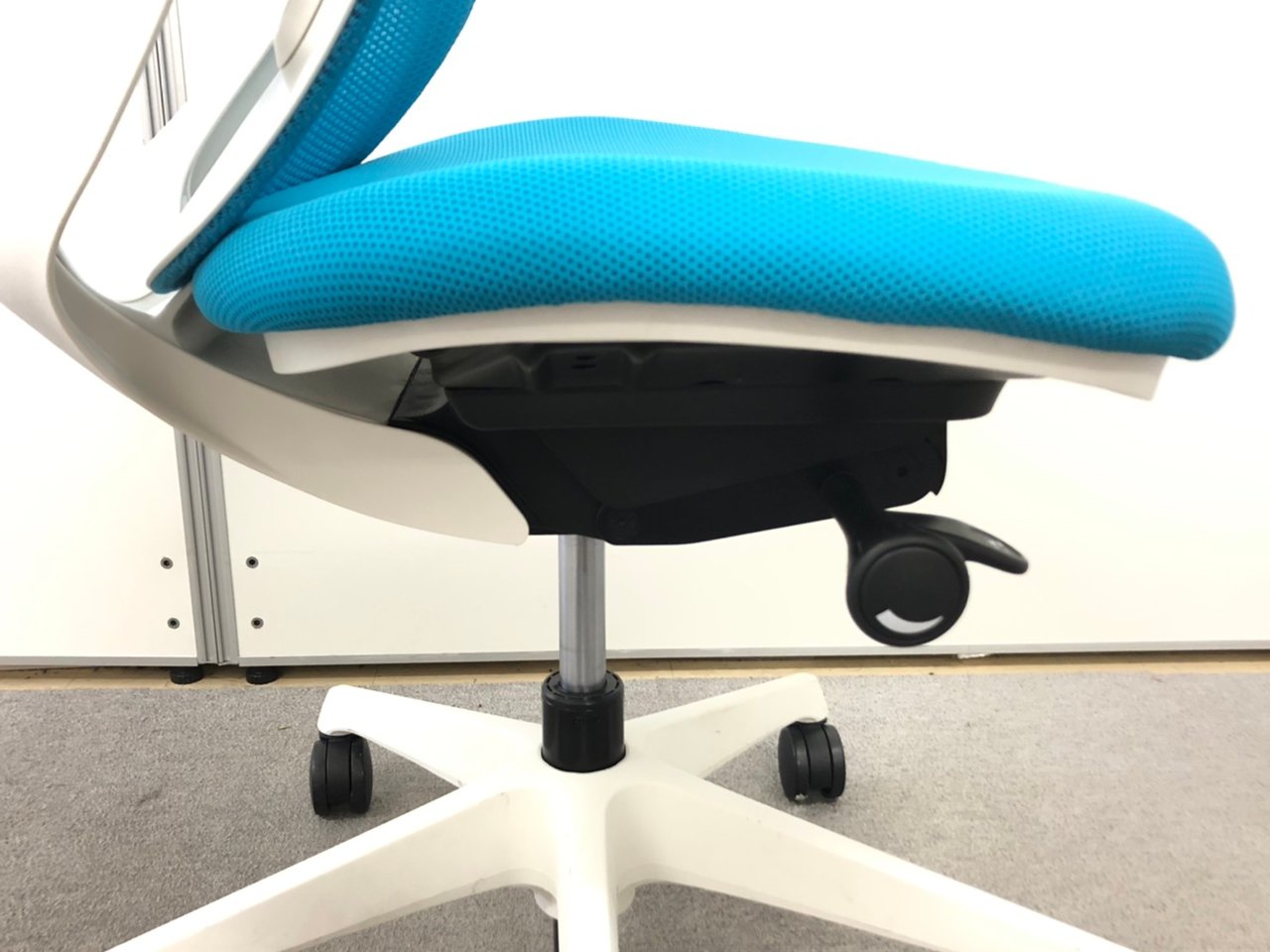 - 座面の左にあるレバー操作により、座面の奥行き調整が可能です。(ストローク:50mm)