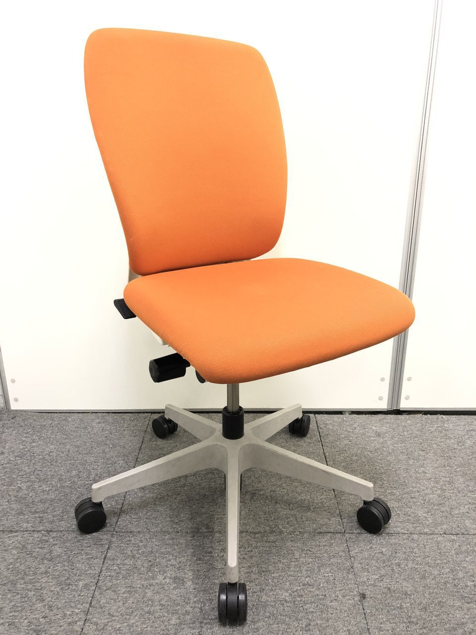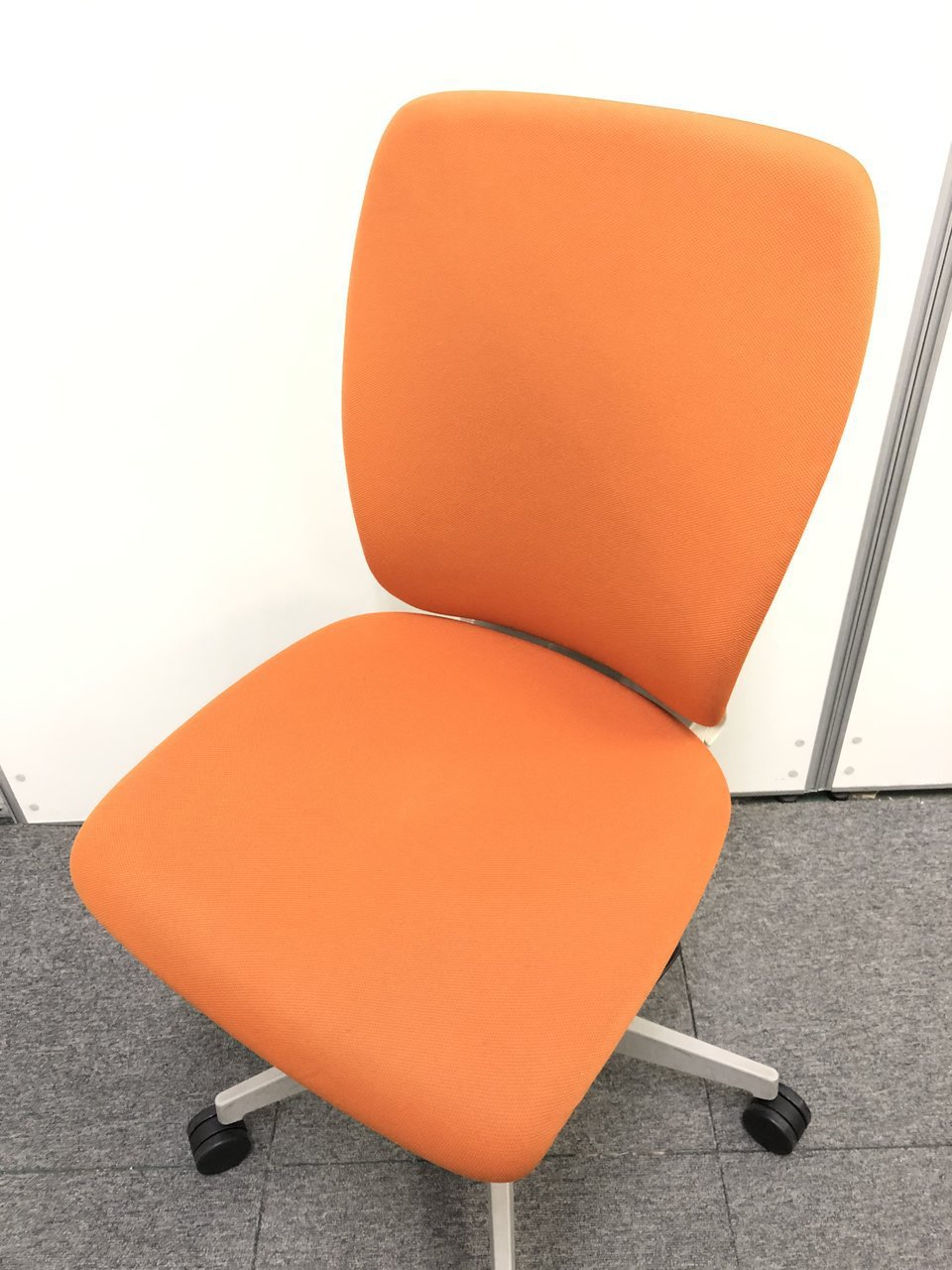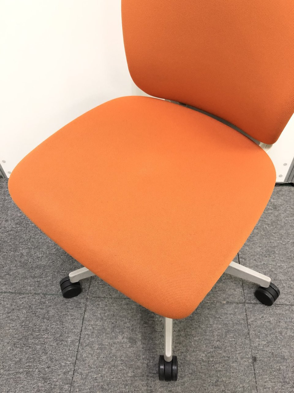 背もたれ、座面ともにオレンジで統一された明るいカラーのオフィスチェアでございます。
