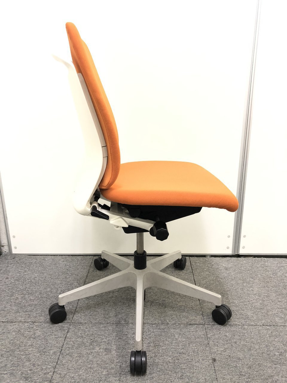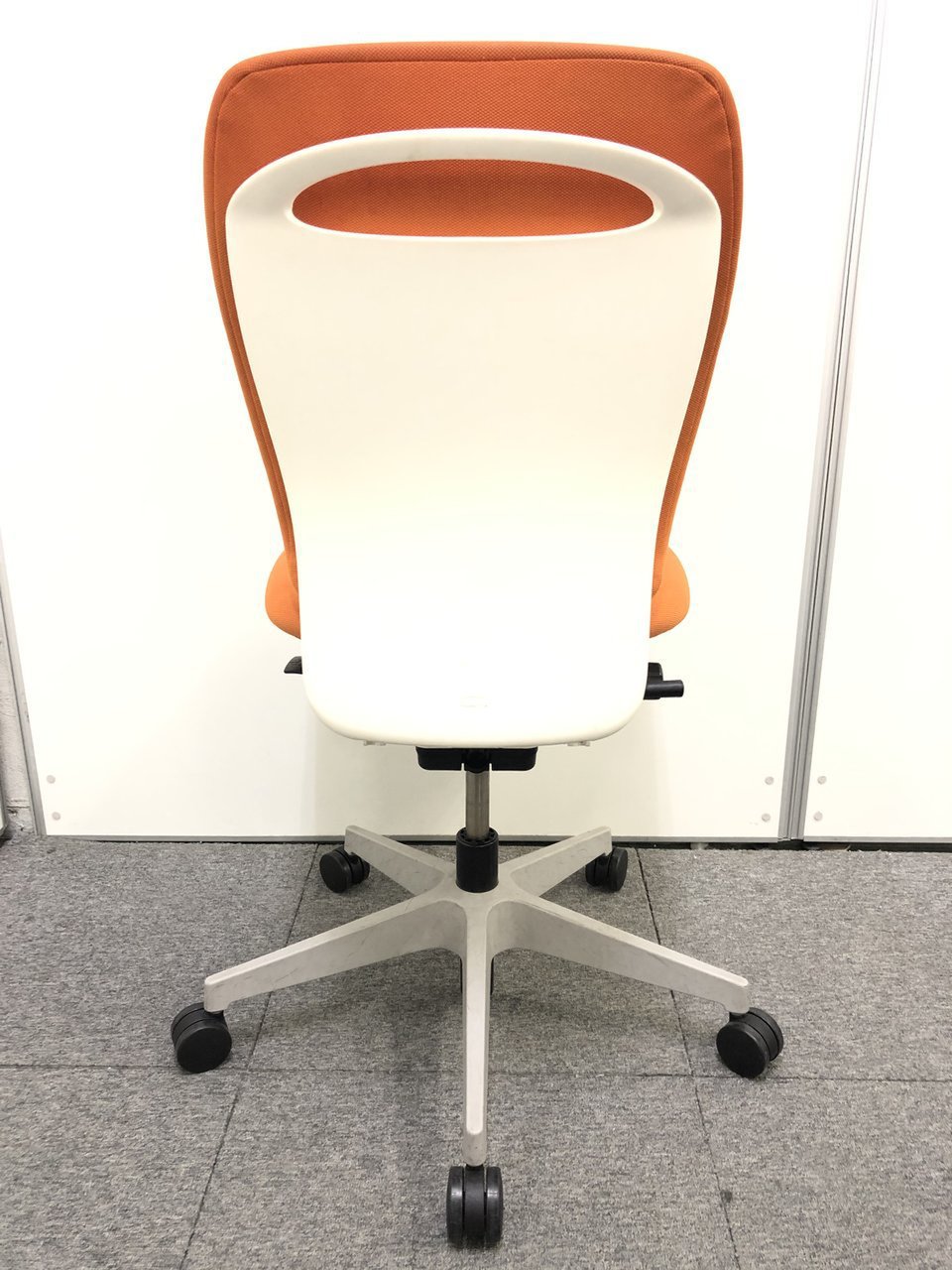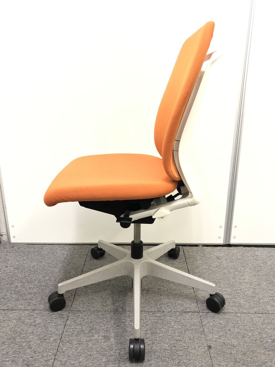 背もたれ、座面ともにオレンジで統一された明るいカラーのオフィスチェアでございます。