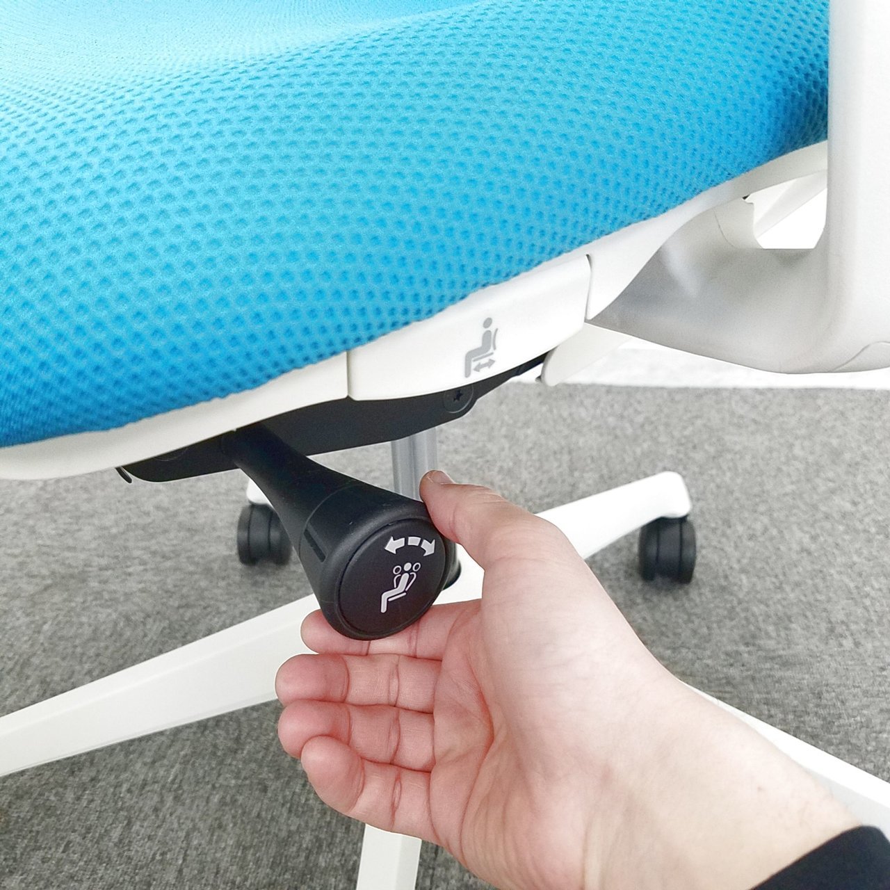 - 座面の左にあるレバー操作により、座面の奥行き調整が可能です。(ストローク:50mm)