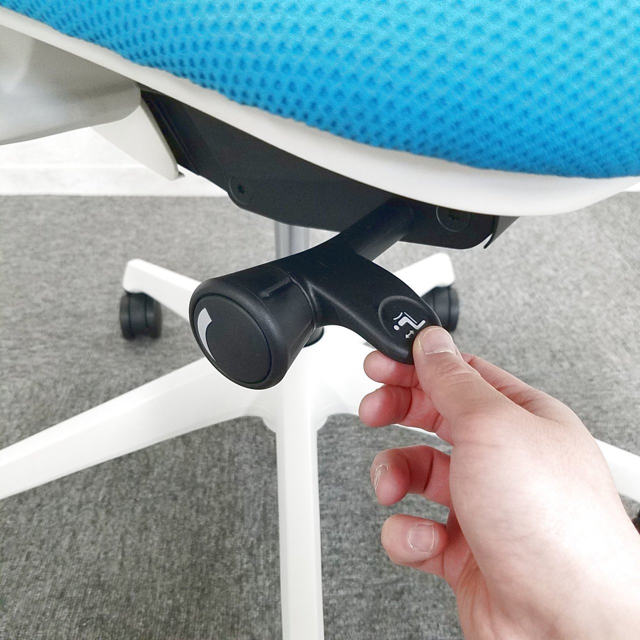 - 座面右下のダイヤル操作で、リクライニングの強弱調整が行えます。これまでのダイヤル式よりも、少ない回転数で、最弱?最強の調整が可能です。