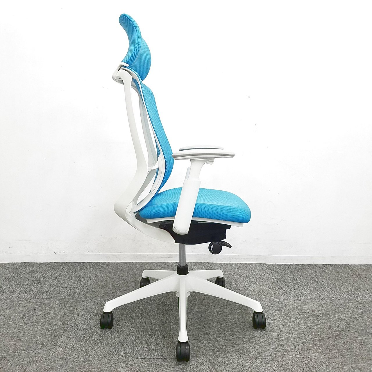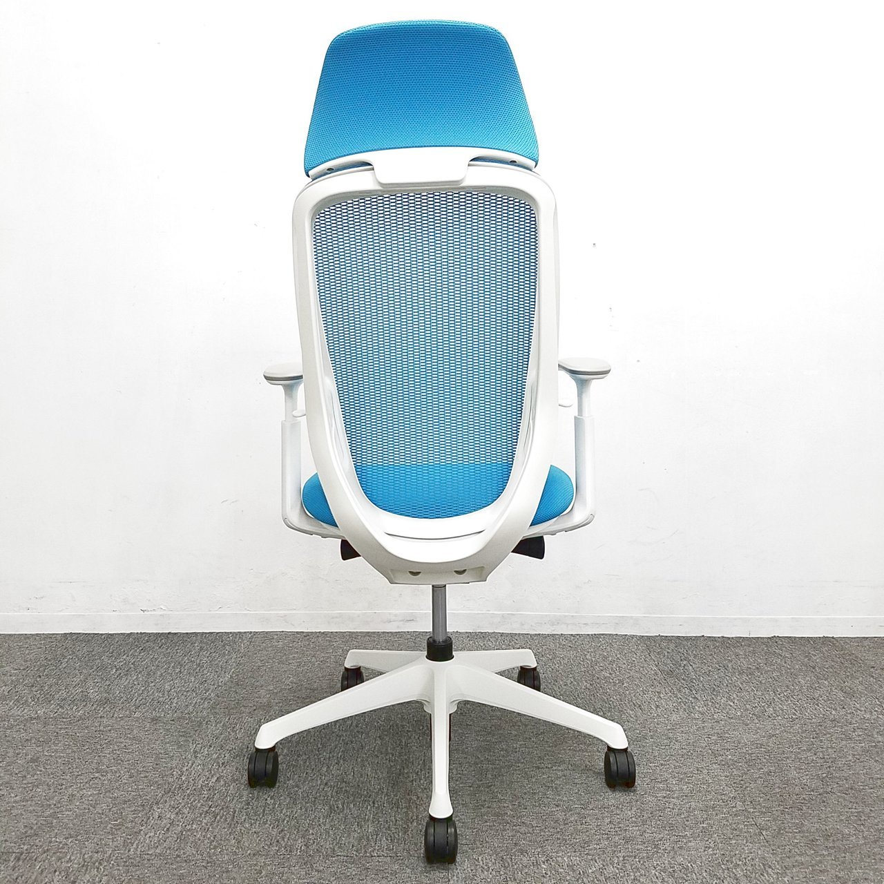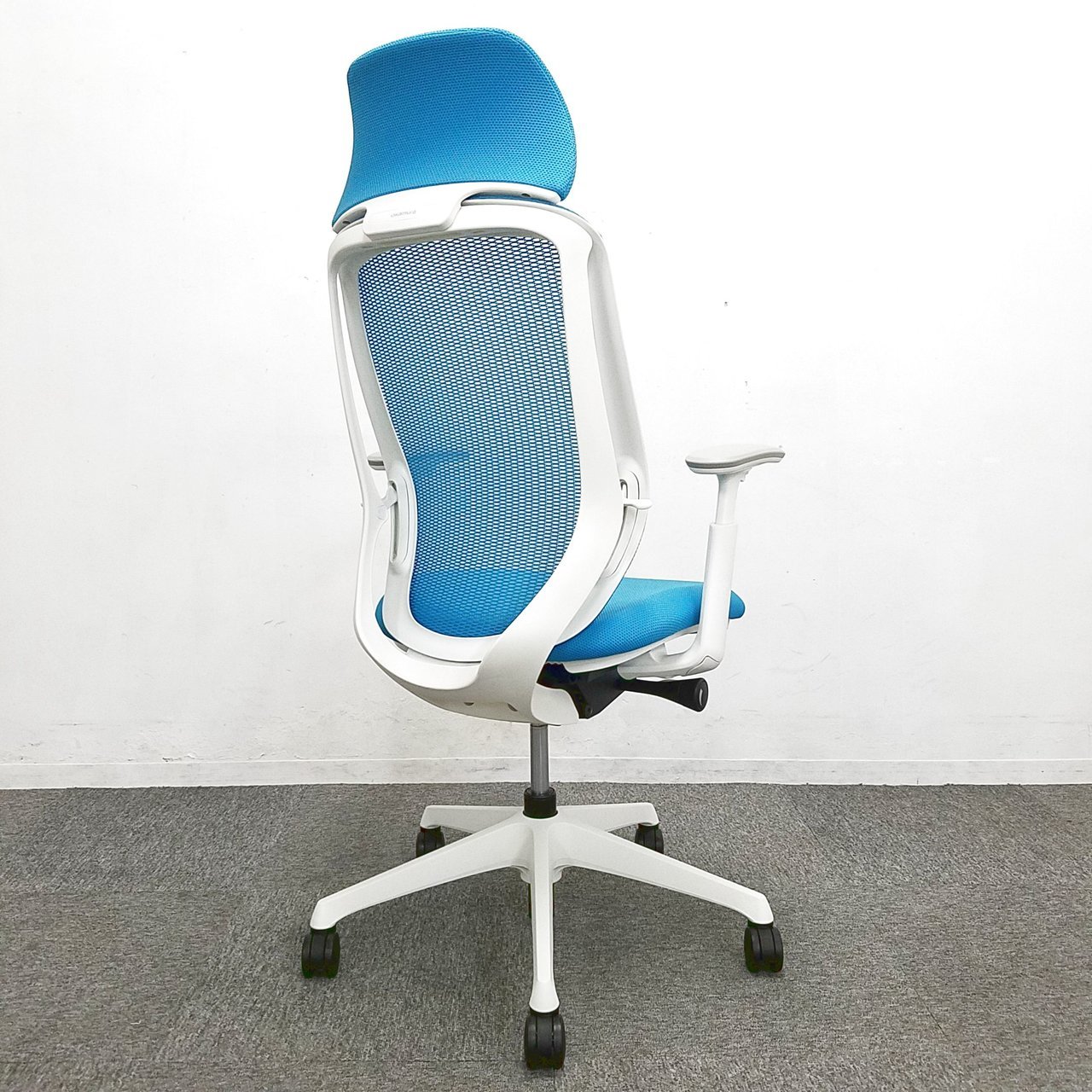 オカムラ製 シルフィー ブルー色 ヘッドレスト 在宅ワーク ホワイトシェル 明るい おすすめ 肘付き ハイバック仕様!!※ヘッドレスは、新品のため取り寄せになります。