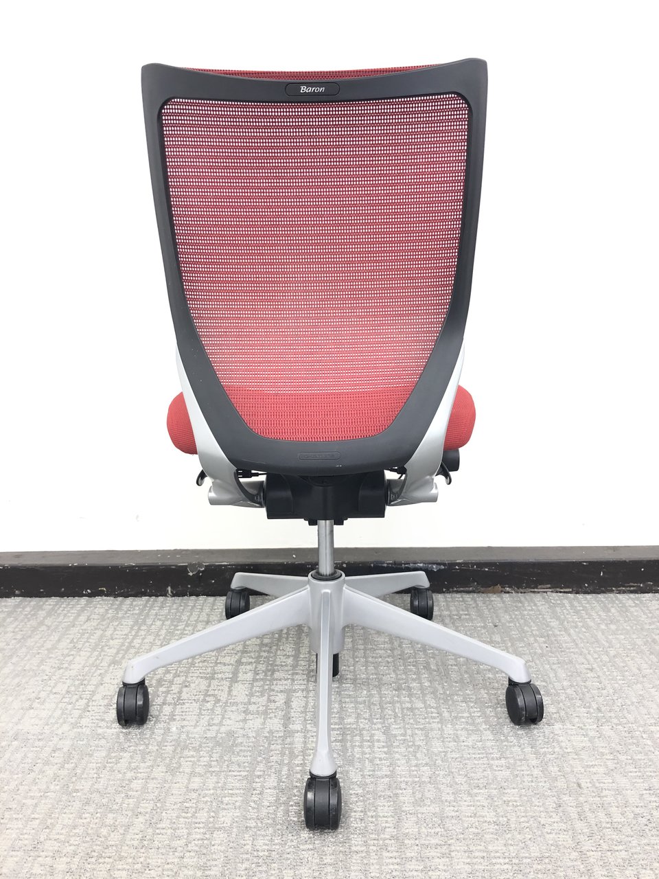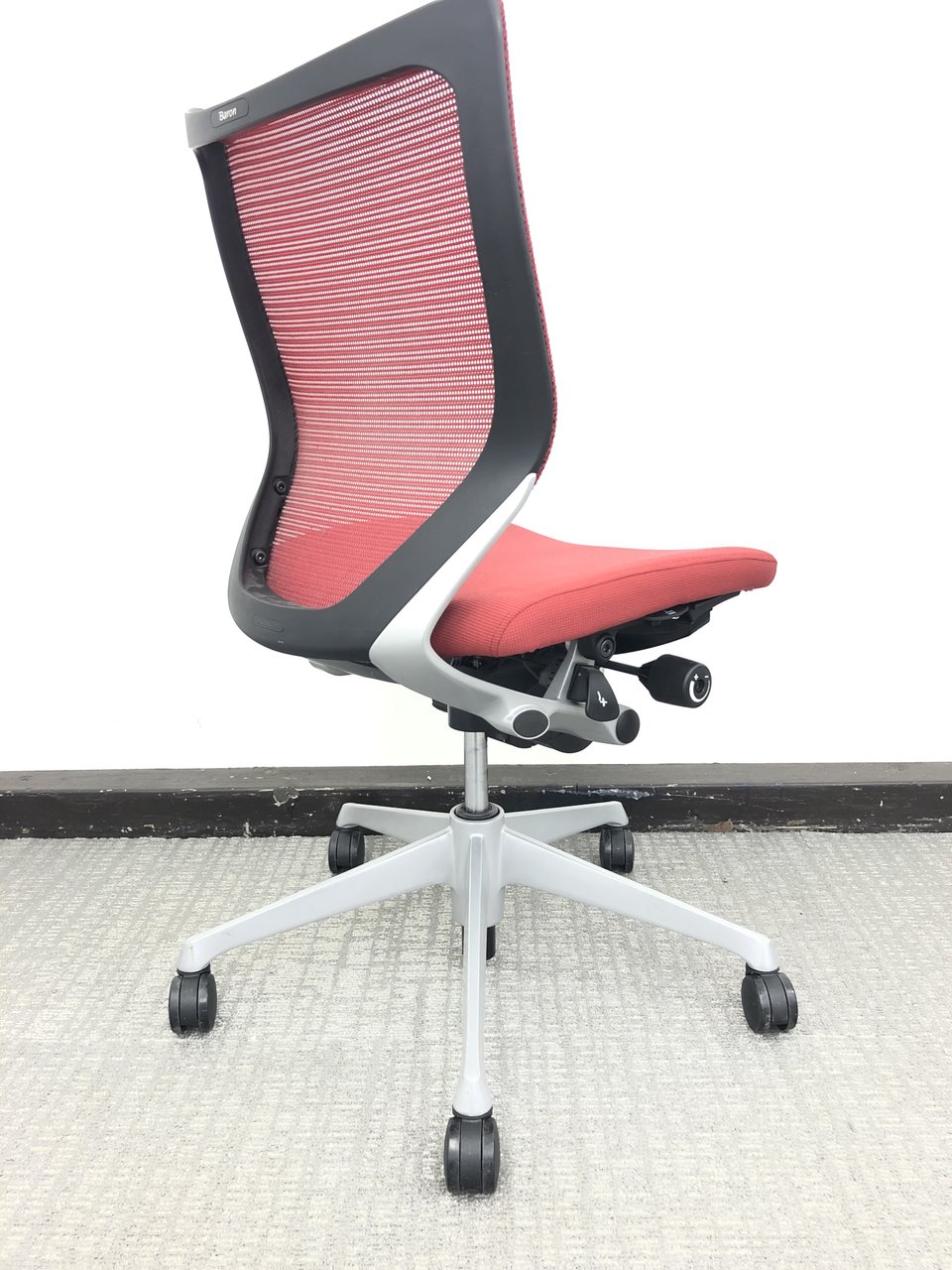 発売当時、既に人気を博していたオカムラの高級チェア、コンテッサから手元で座高調整ができるスマートオペレーション機能を取り除くなどしてリーズナブルにしたのがバロンです。その際に少しだけコンパクト化されました。そのことが、日本人の体格、日本のオフィス、家庭環境に適し、国内で多くのシェアを獲得する要因の一つになったのではないかと思います。