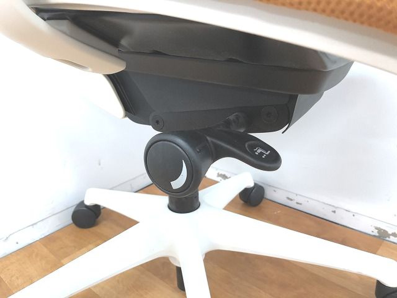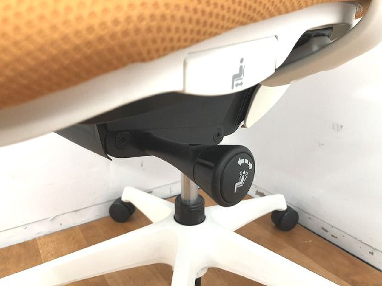 - 座面左下のダイヤルでリクライニングの固定と解除が行えます。 前傾ポジションをとることも可能です。