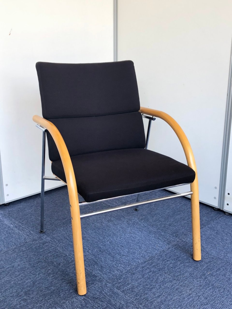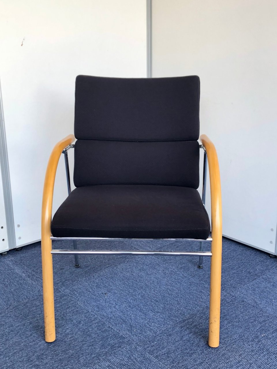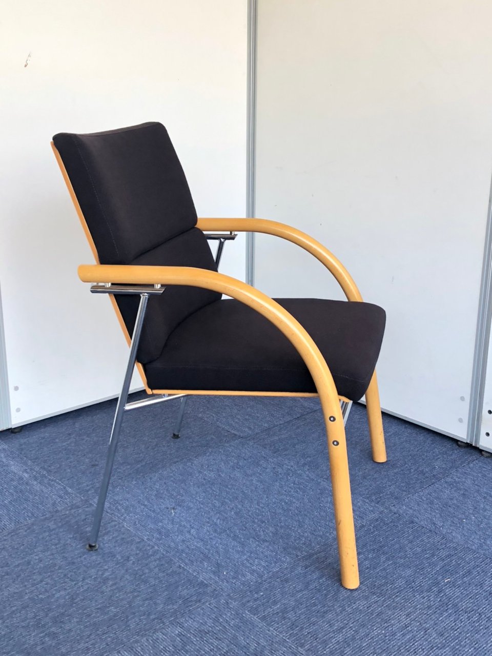 軽やかな印象を与える木目の肘付アームチェア。遠目から見るとまるで座面が宙に浮いているように見える先鋭的なデザイン。ハイクラスな応接スペースに貢献します。安心のオカムラ製。- 神戸・三宮店