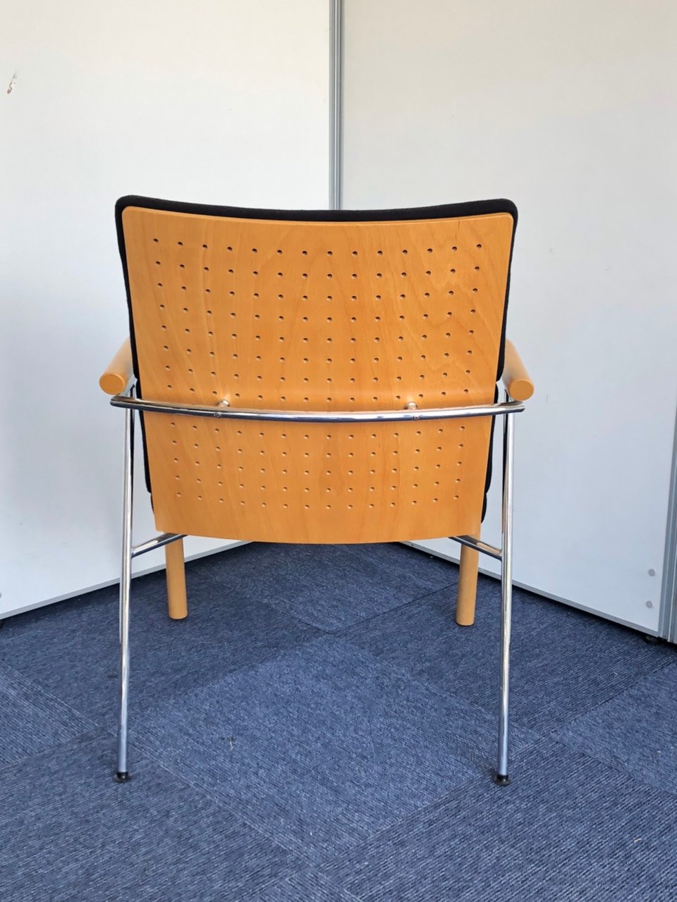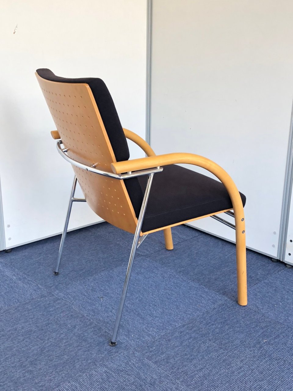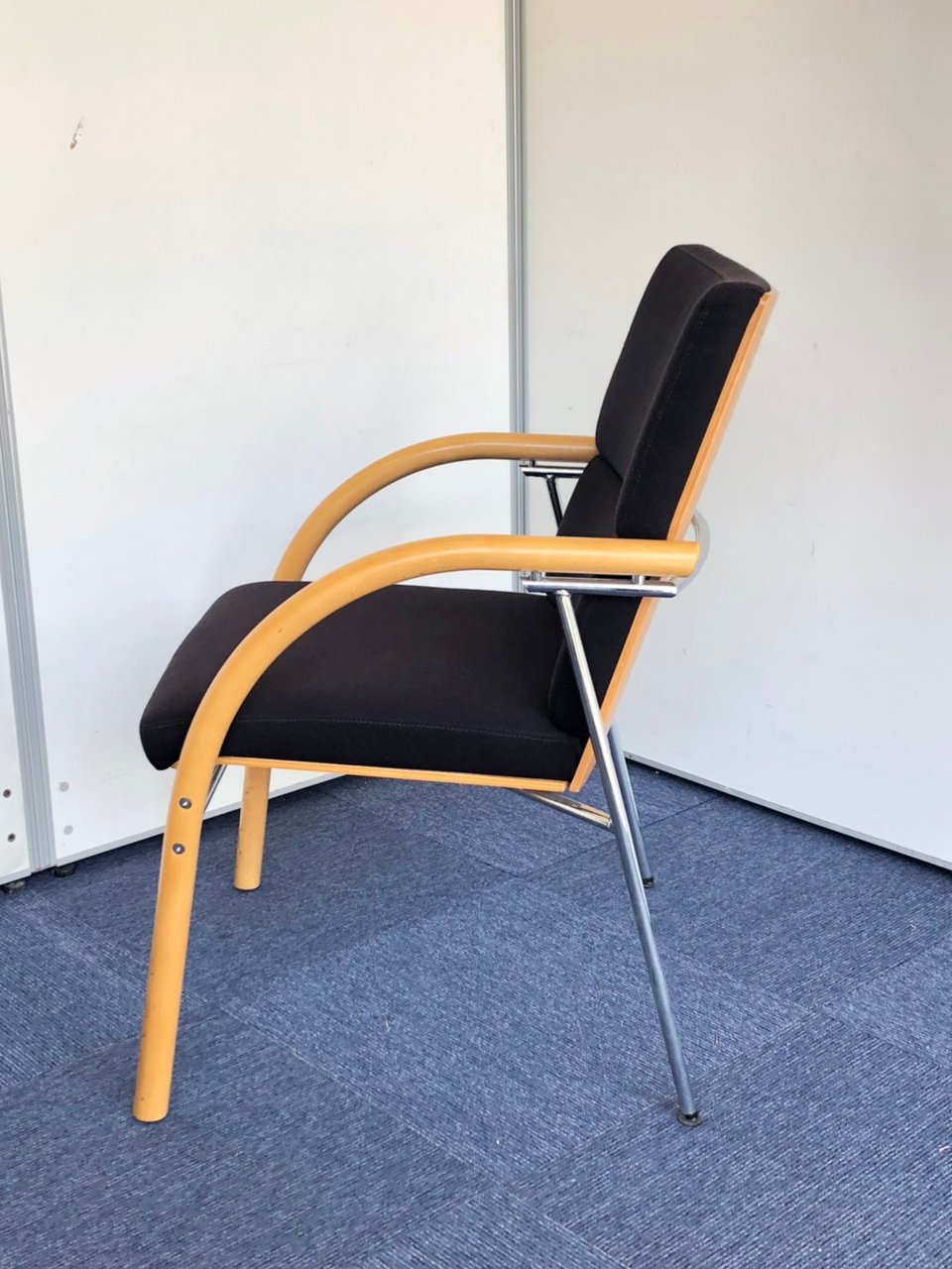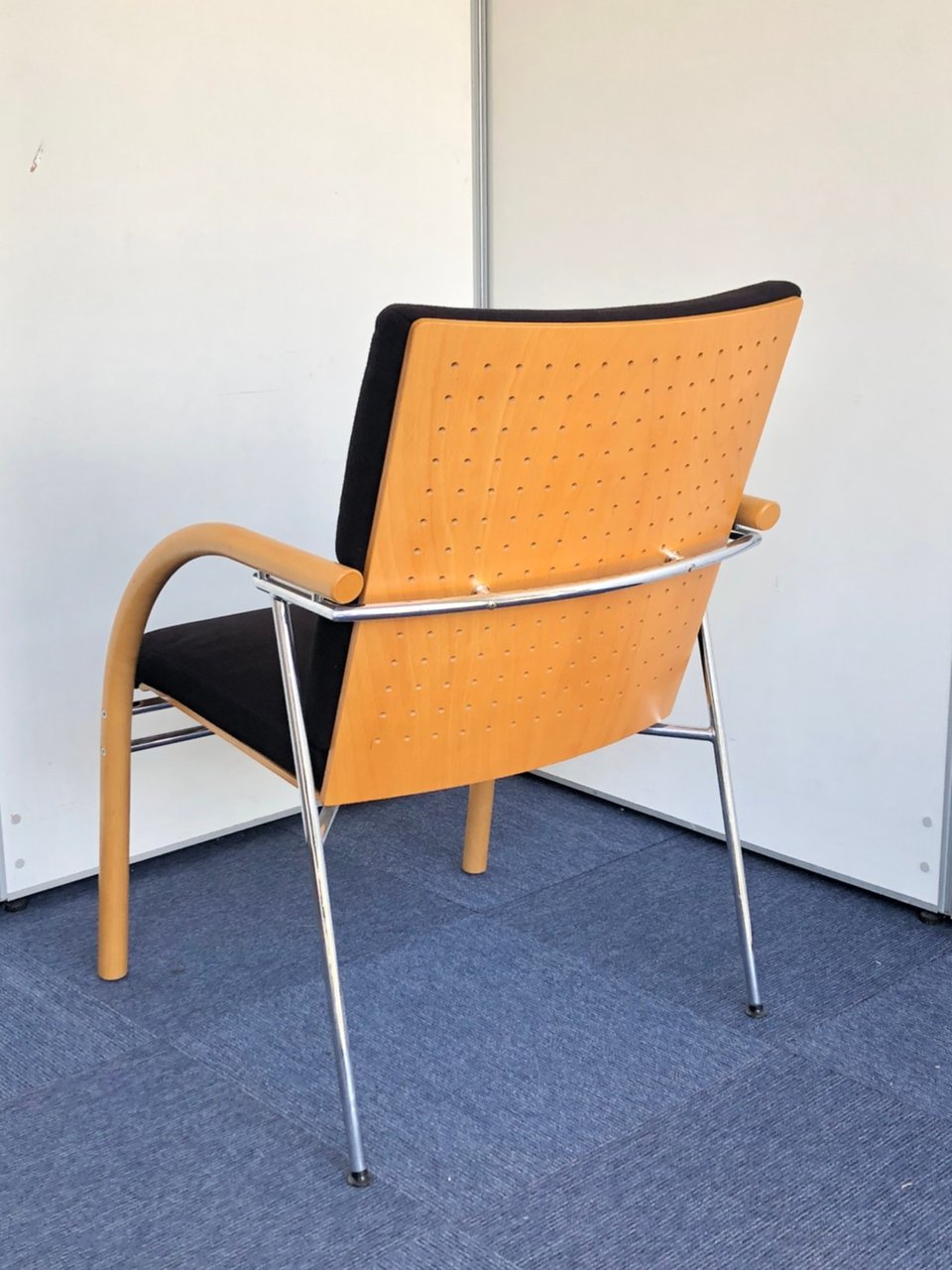 軽やかな印象を与える木目の肘付アームチェア。遠目から見るとまるで座面が宙に浮いているように見える先鋭的なデザイン。ハイクラスな応接スペースに貢献します。安心のオカムラ製。- 神戸・三宮店