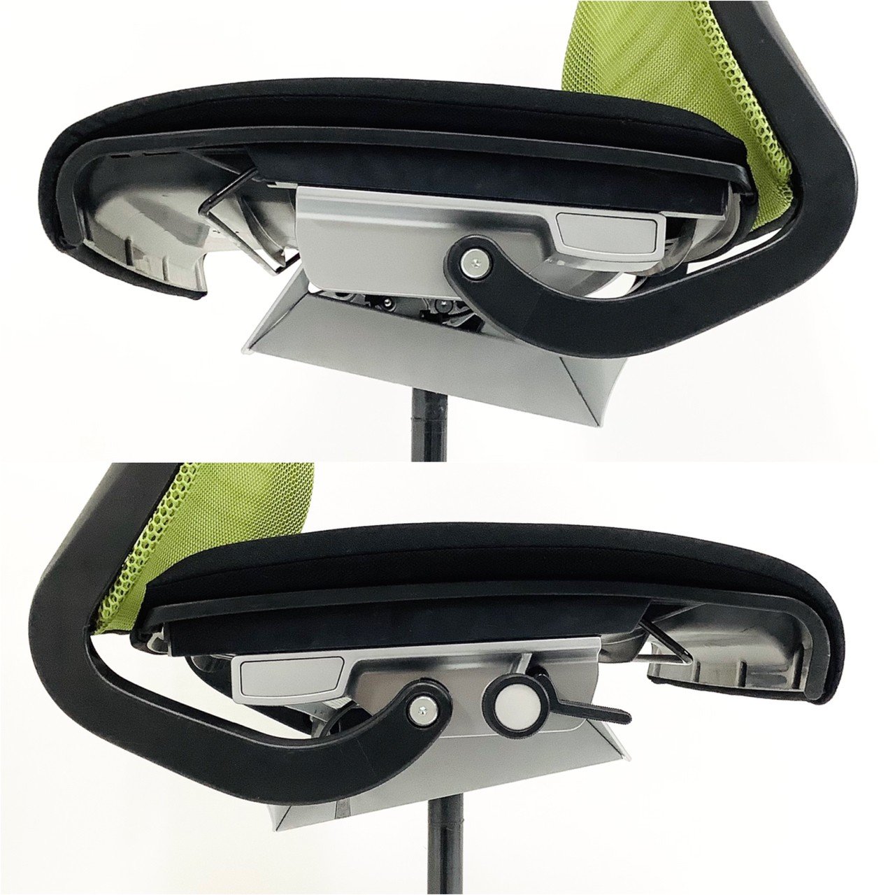 快適な座り心地に不可欠な調節機能である、上下昇降、座面の奥行き調整、リクライニングなどを備えており、操作もわかりやすく好評です。 特に、座面の奥行きは、座面下の左右に通った細いバーで調整でき、座ったままで軽やかに滑るように調整が可能です。 価格面では、新品では高めですが、中古は流通も多く、定価の3割前後の価格で高級チェアの座り心地を手に入れることができます!