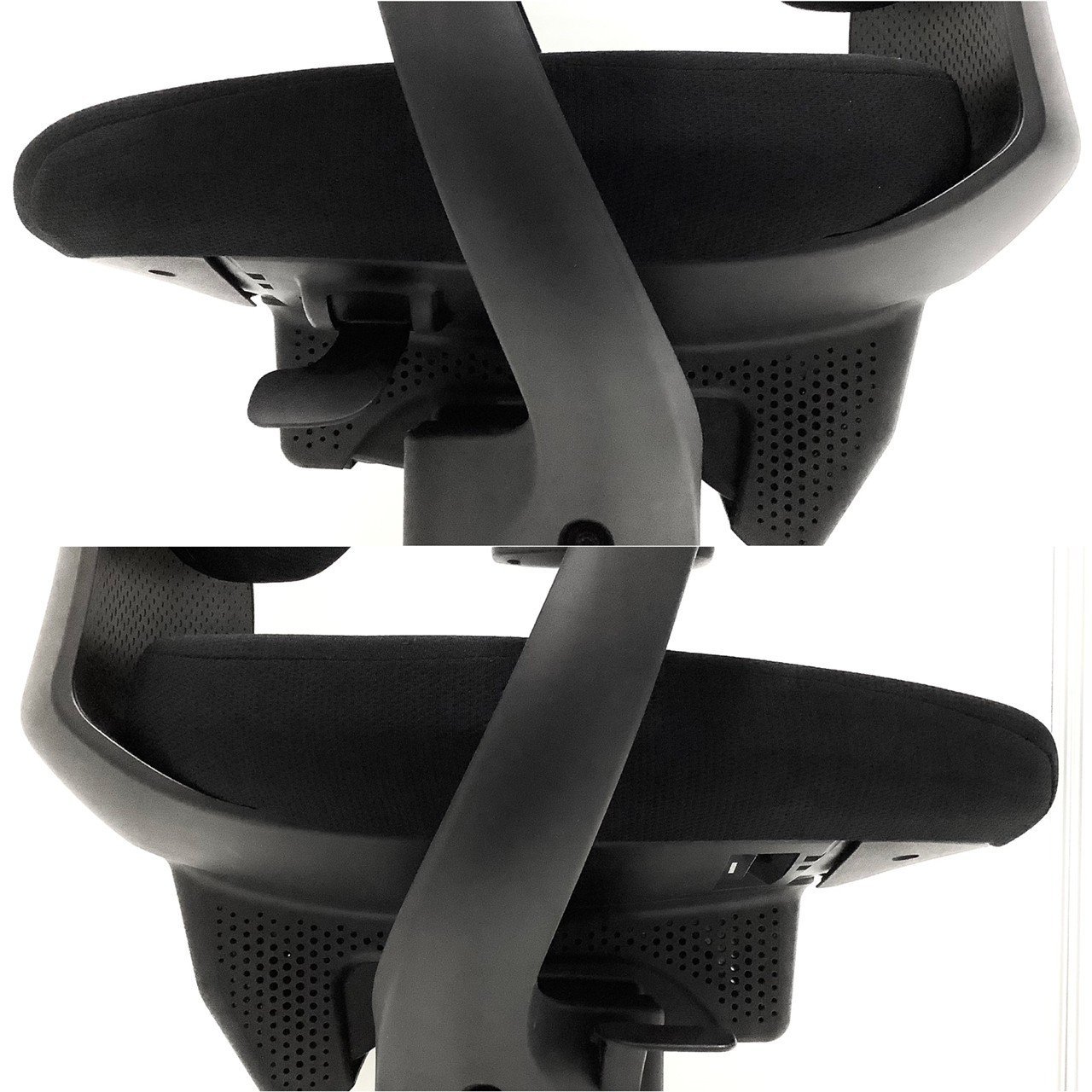 - 座面前部が折れ曲がるので、後傾時に太腿の裏側を圧迫しません。体の小さな方でも圧迫が少なく、座面奥行きの調整が不要です。