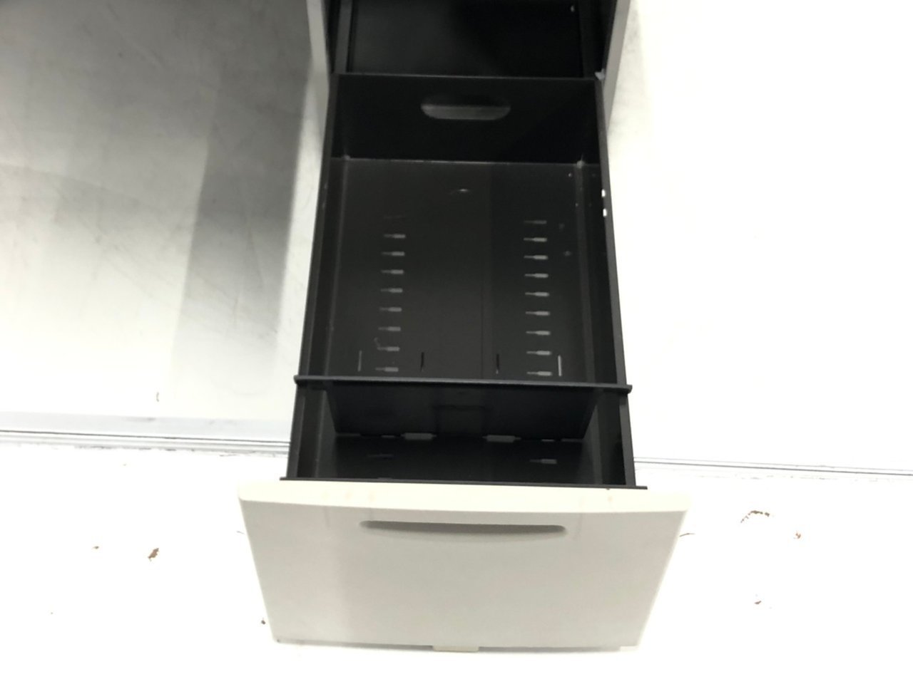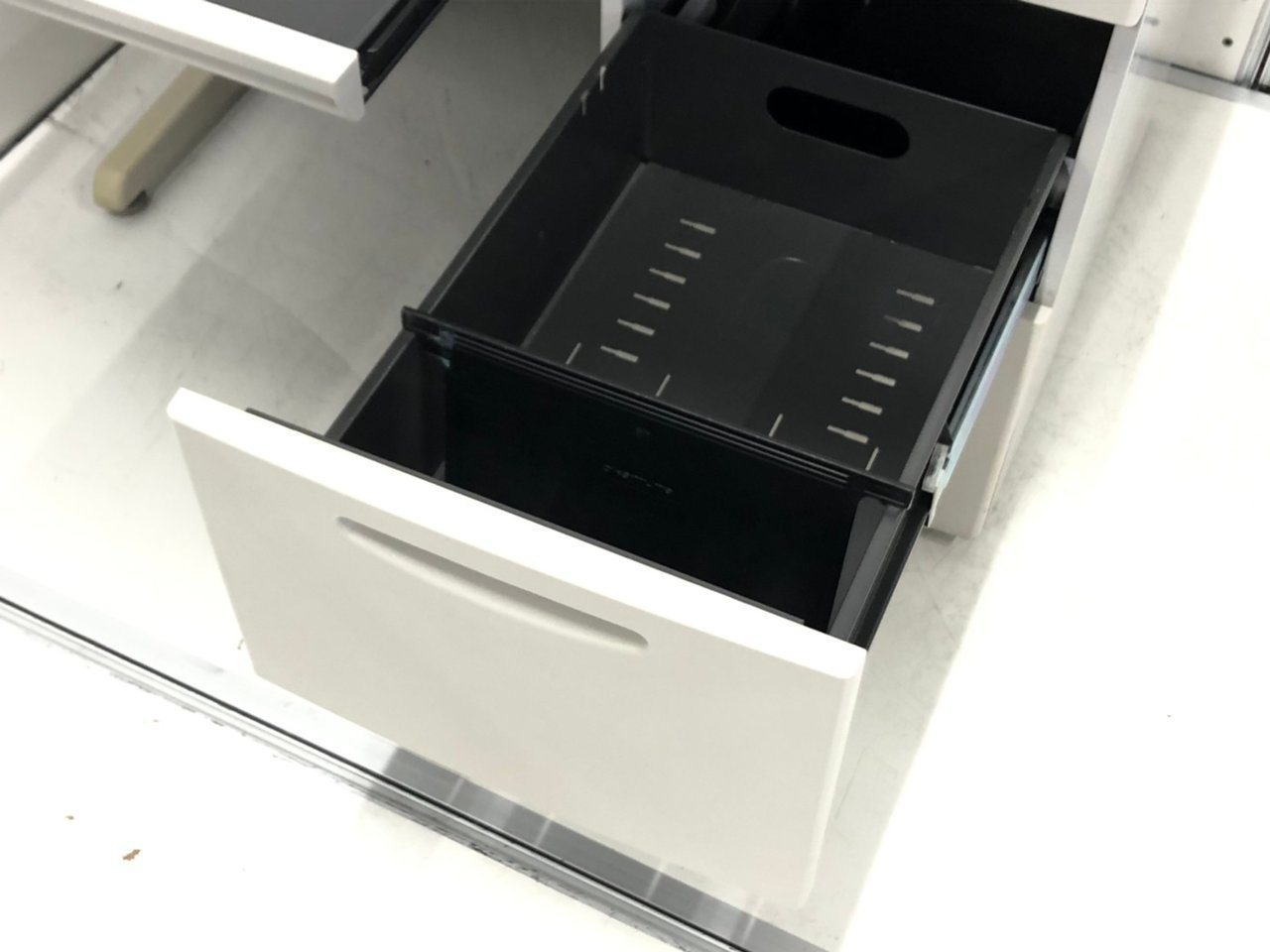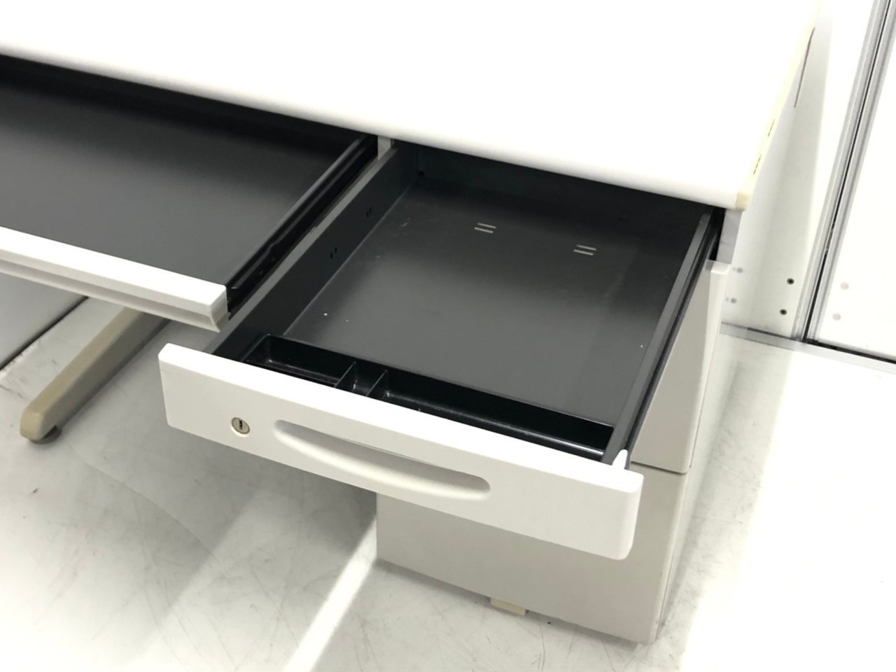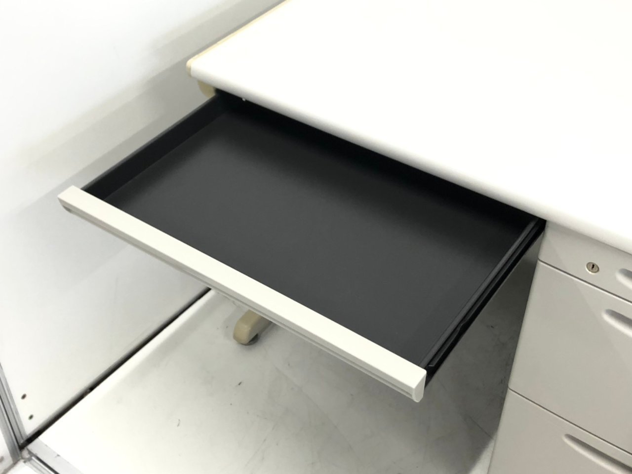 - 袖机のワゴンは、最下段がロング引出しになっており、従来より収納力120%アップ。