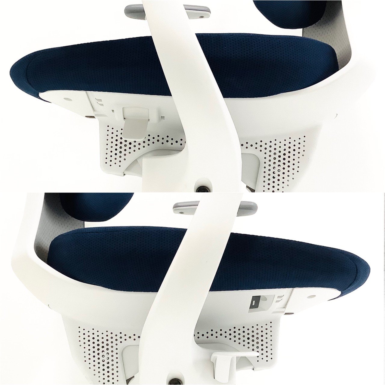 - 座面前部が折れ曲がるので、後傾時に太腿の裏側を圧迫しません。体の小さな方でも圧迫が少なく、座面奥行きの調整が不要です。