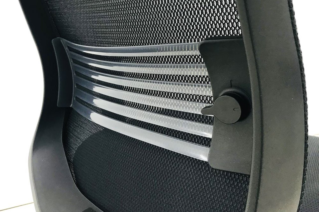 背もたれがメッシュのチェアは、構造上、外枠となるフレームが存在します。小さめのメッシュチェアは背中にフレームが当たったり、メッシュの弾性を十分に得ることができないので、一般にメッシュチェアは大型になりがちです。しかし、シロッコチェアは、フレームを横ではなく縦方向に厚くしたバーチカルフレームで強度を確保しており、 小さめのボディでありながらメッシュ面が広く作られています。