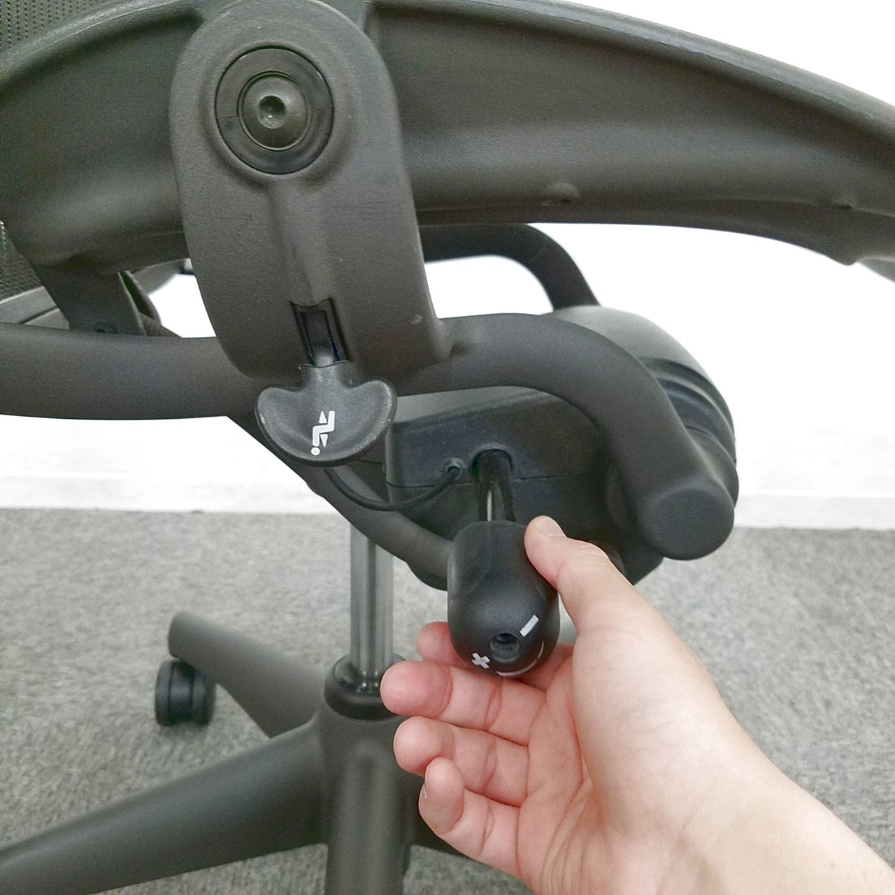 - ノブを+方向に回すと背もたれのリクライニング が硬くなり、-方向に回すと柔らかくなります。