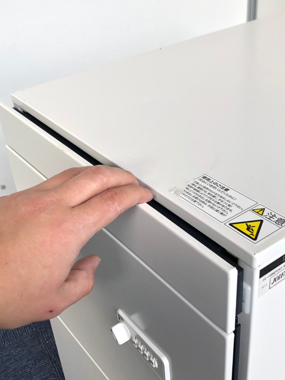 正面に取っ手が無く、1段目は引き出しの上部から、2段目・3段目は引き出しの側面から開ける形になります。