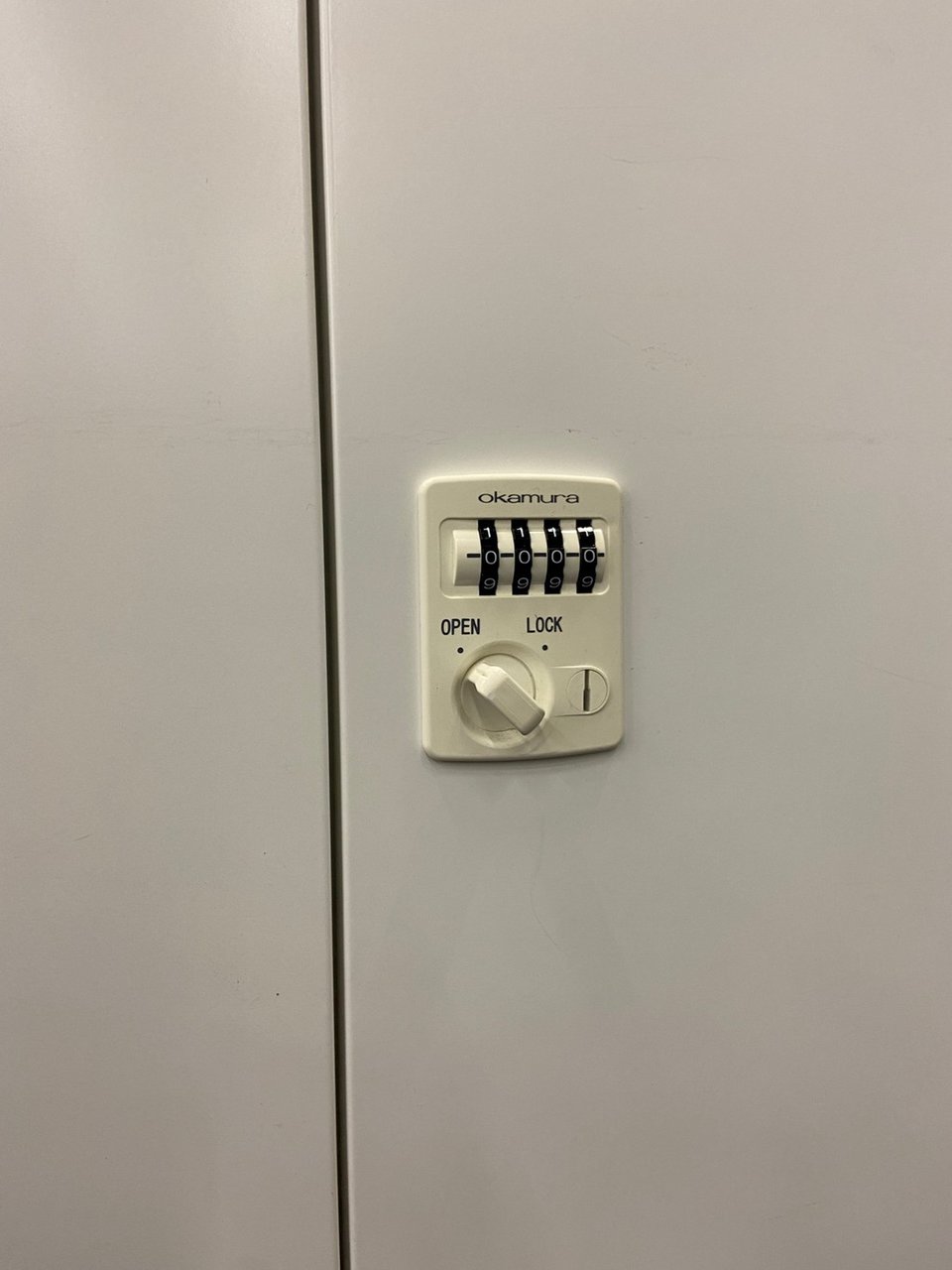 ダイヤル錠、4桁の暗証番号で鍵がかかる為、鍵を抜き差しする必要がございません。。