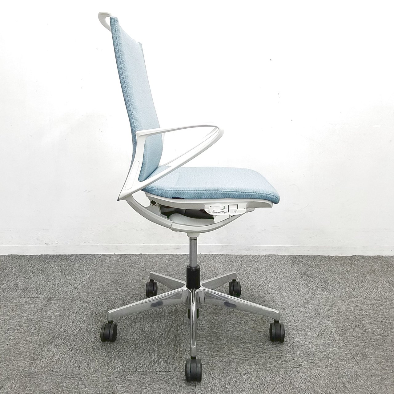- 座面の高さ調節や背と座がシンクロしてスライドするアンクルチルトリクライニングなど、基本的な調節機能を搭載。