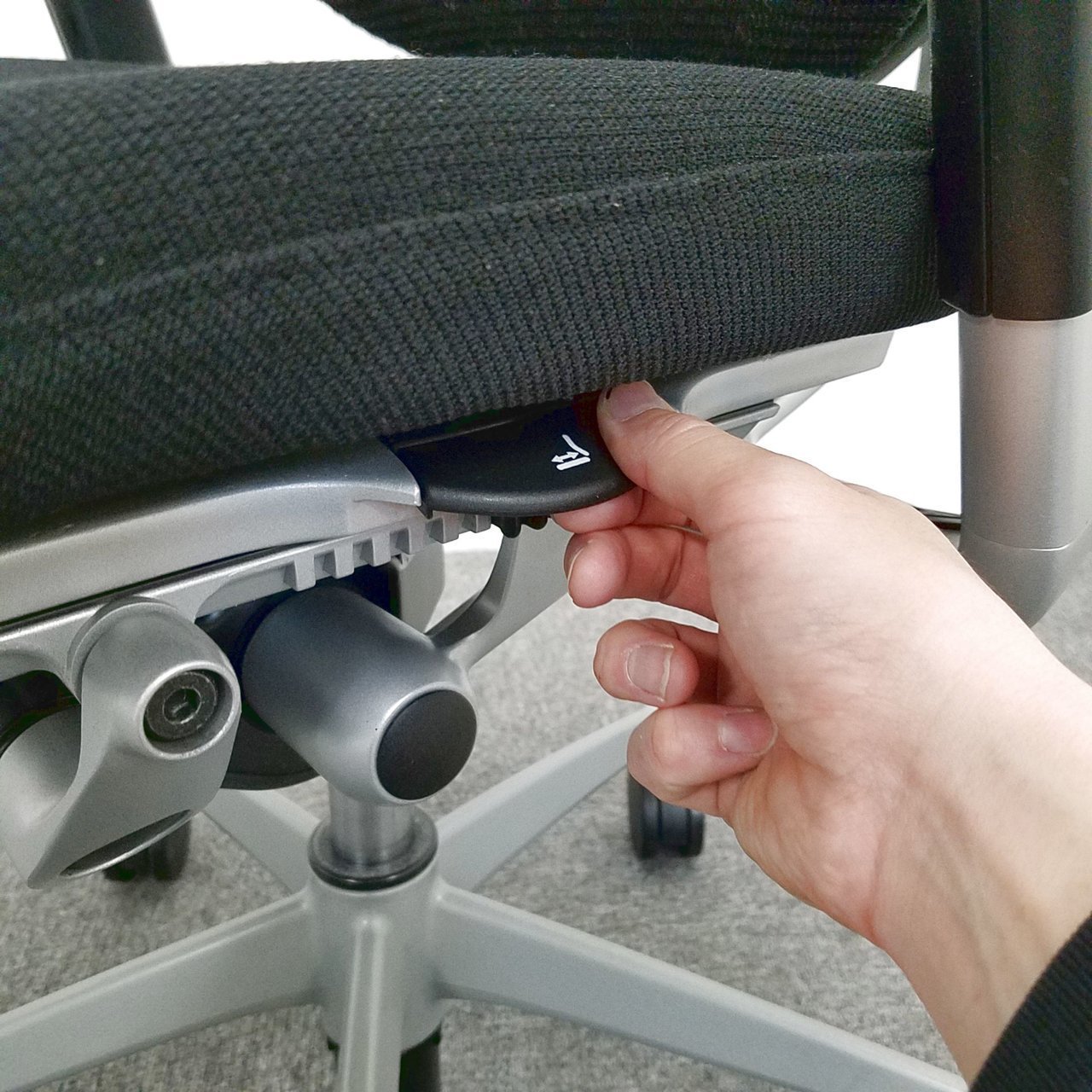 - 座面の前後スライド調整レバーで操作(前後50mm分調整で)できます。(グラデーションサポートメッシュタイプを除く)
