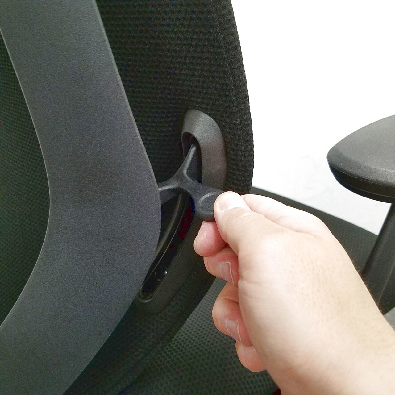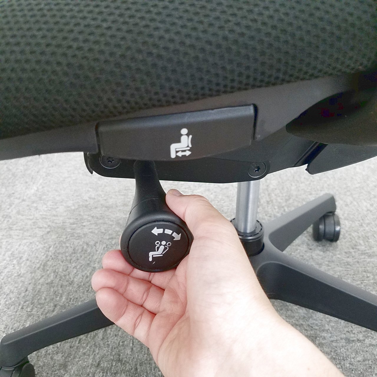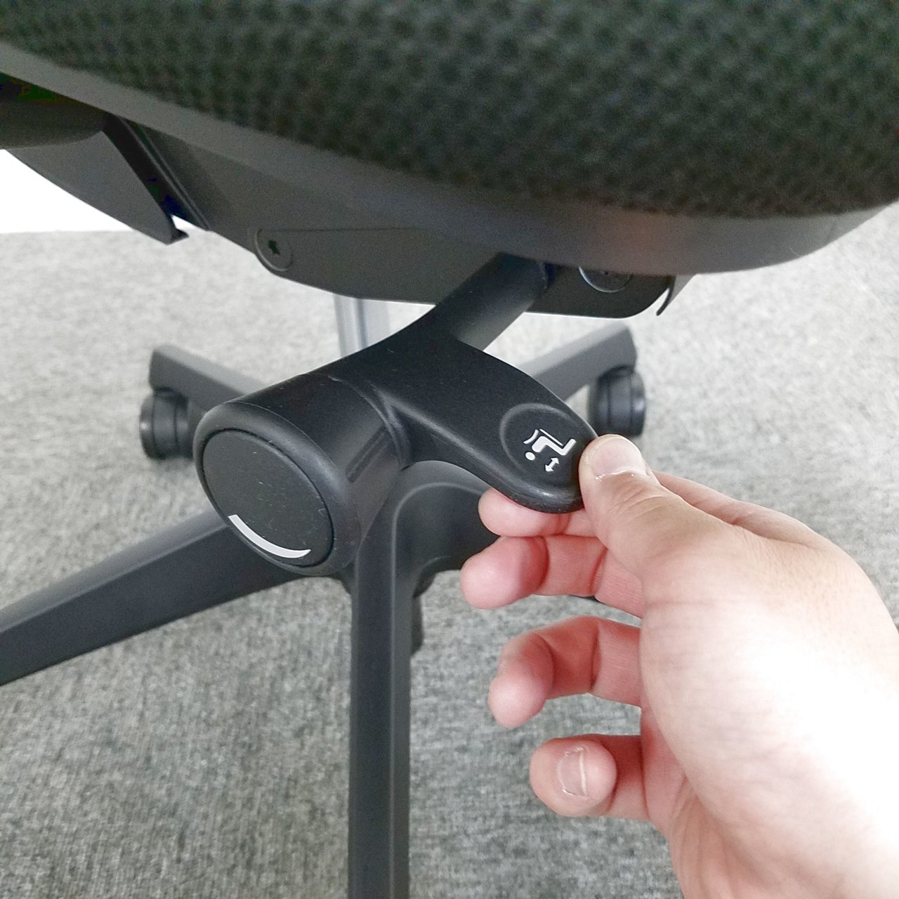 - 座面右下のダイヤル操作で、リクライニングの強弱調整が行えます。これまでのダイヤル式よりも、少ない回転数で、最弱?最強の調整が可能です。