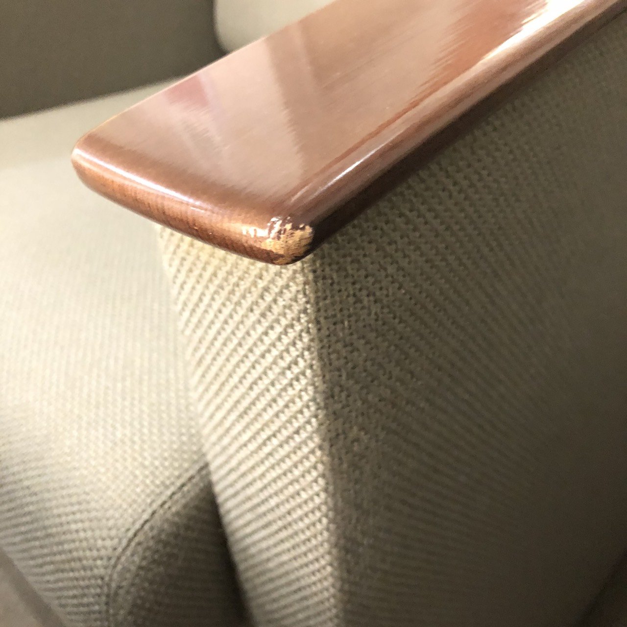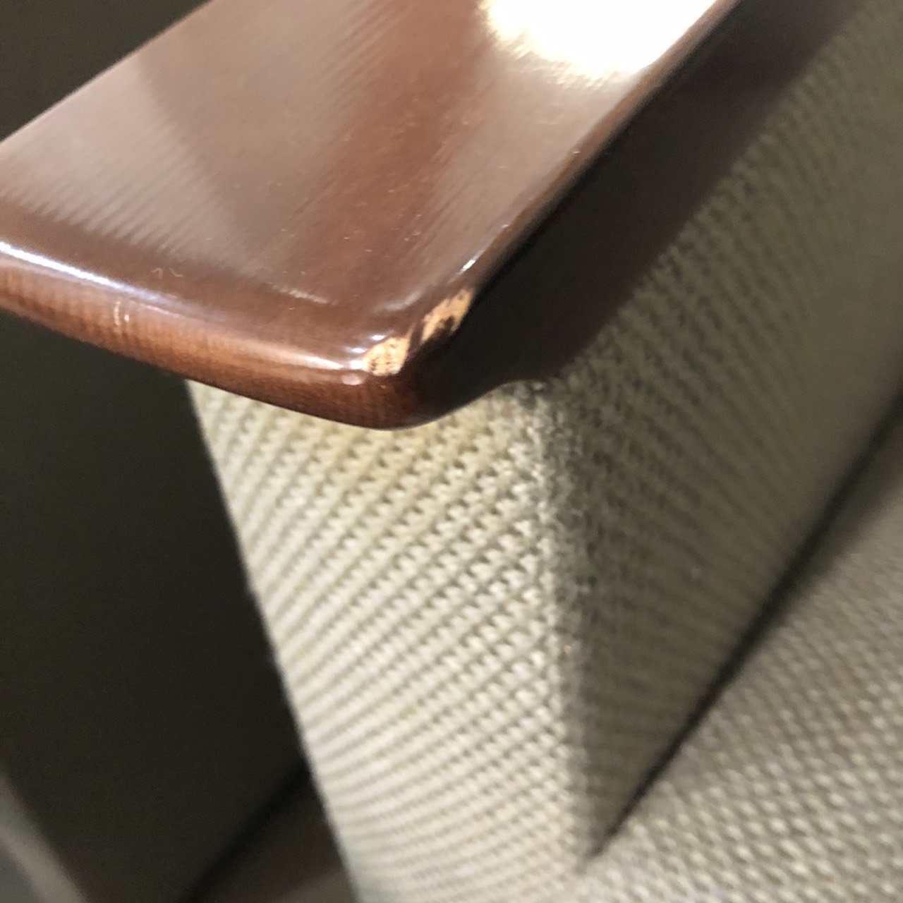 - あり黄ばみ・変色が広い範囲にうっすらある、または濃い黄ばみ・変色が一部ある。(例:三人用ソファ、二人用ソファ、一人用ソファの場合、背もたれ、肘かけ、座面等、 センターテーブルの場合、天板、脚にある。)