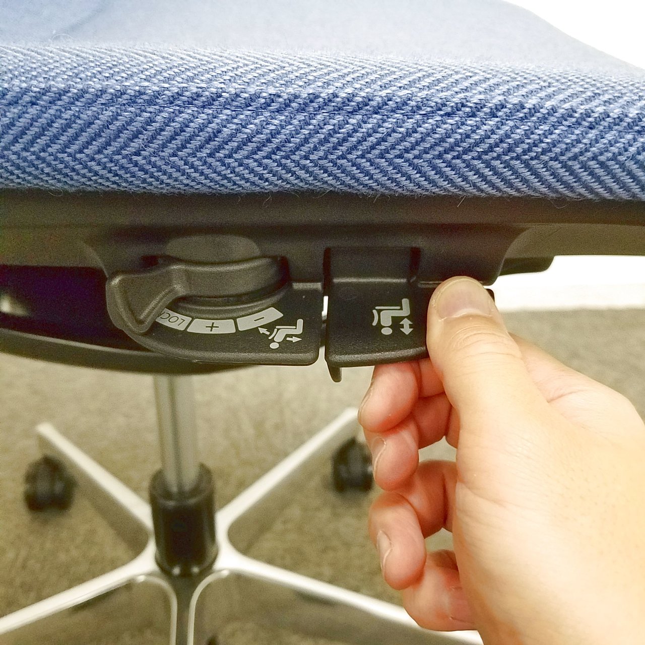 - 座面の高さ調節や背と座がシンクロしてスライドするアンクルチルトリクライニングなど、基本的な調節機能を搭載。