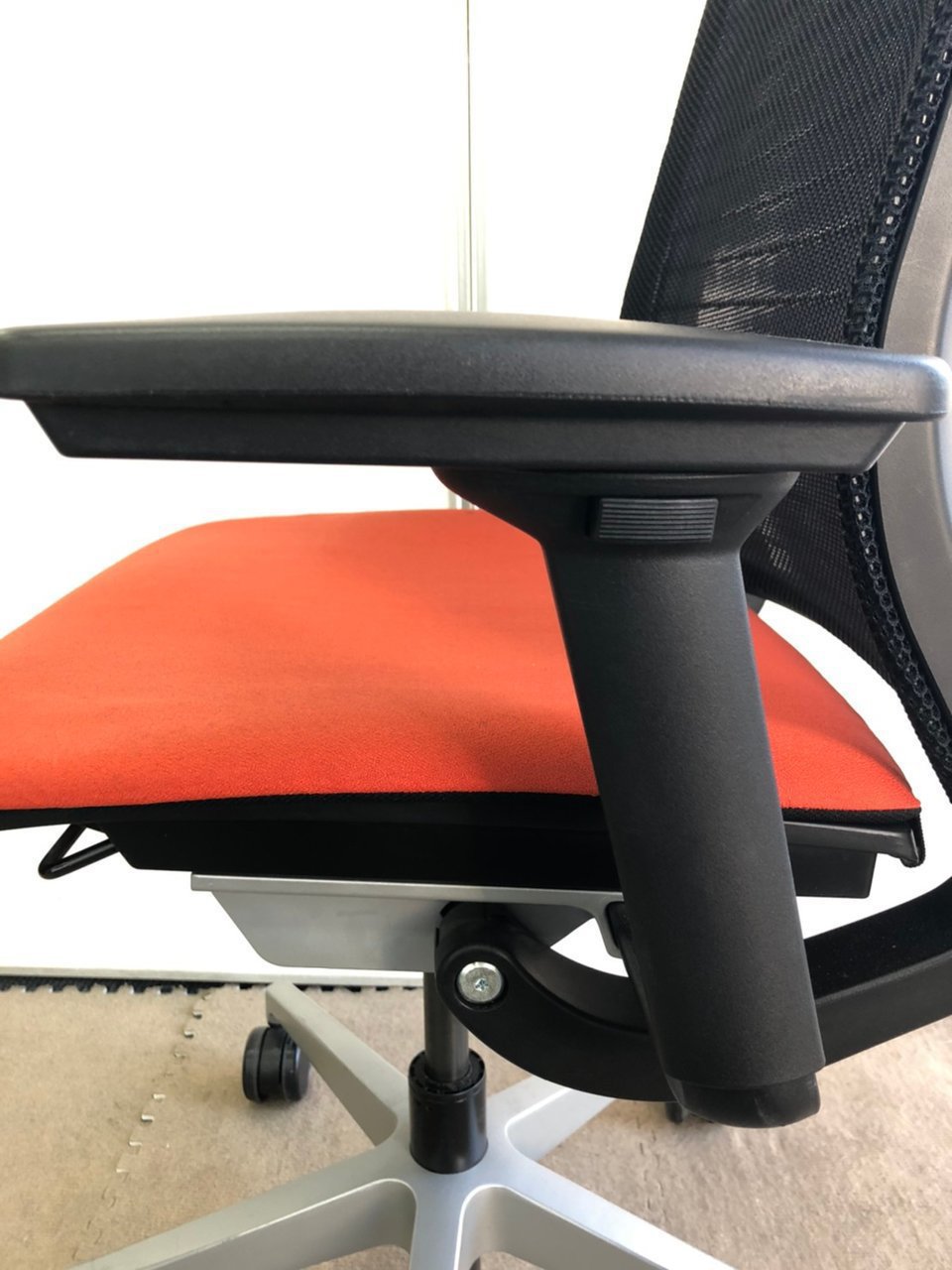 - レバーを引き上げながら座面を前後にスライドさせ、レバーを放すとロックします。背もたれに身体をつけた状態で膝の裏側と座面のエッジの間に5-8センチほどの隙間ができるのが理想的です。
