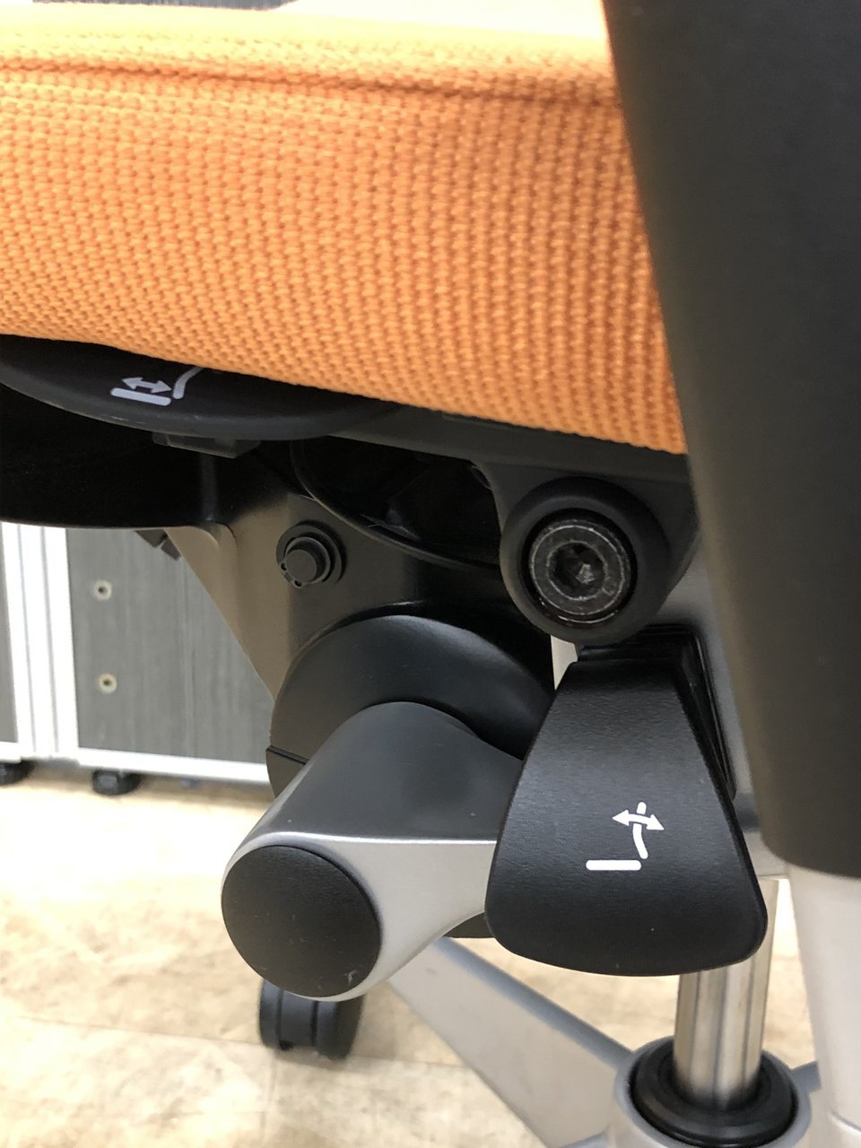 - 座面の右下にあるレバーの操作により座面位置を上下に100mm分調整することが可能です。