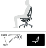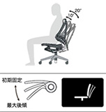 - ロッキングの後傾角度の範囲を、初期固定/10°/20°の3段階に調節可能。 簡単なレバー操作で、仕事の内容に合わせ手軽に調節できます。
