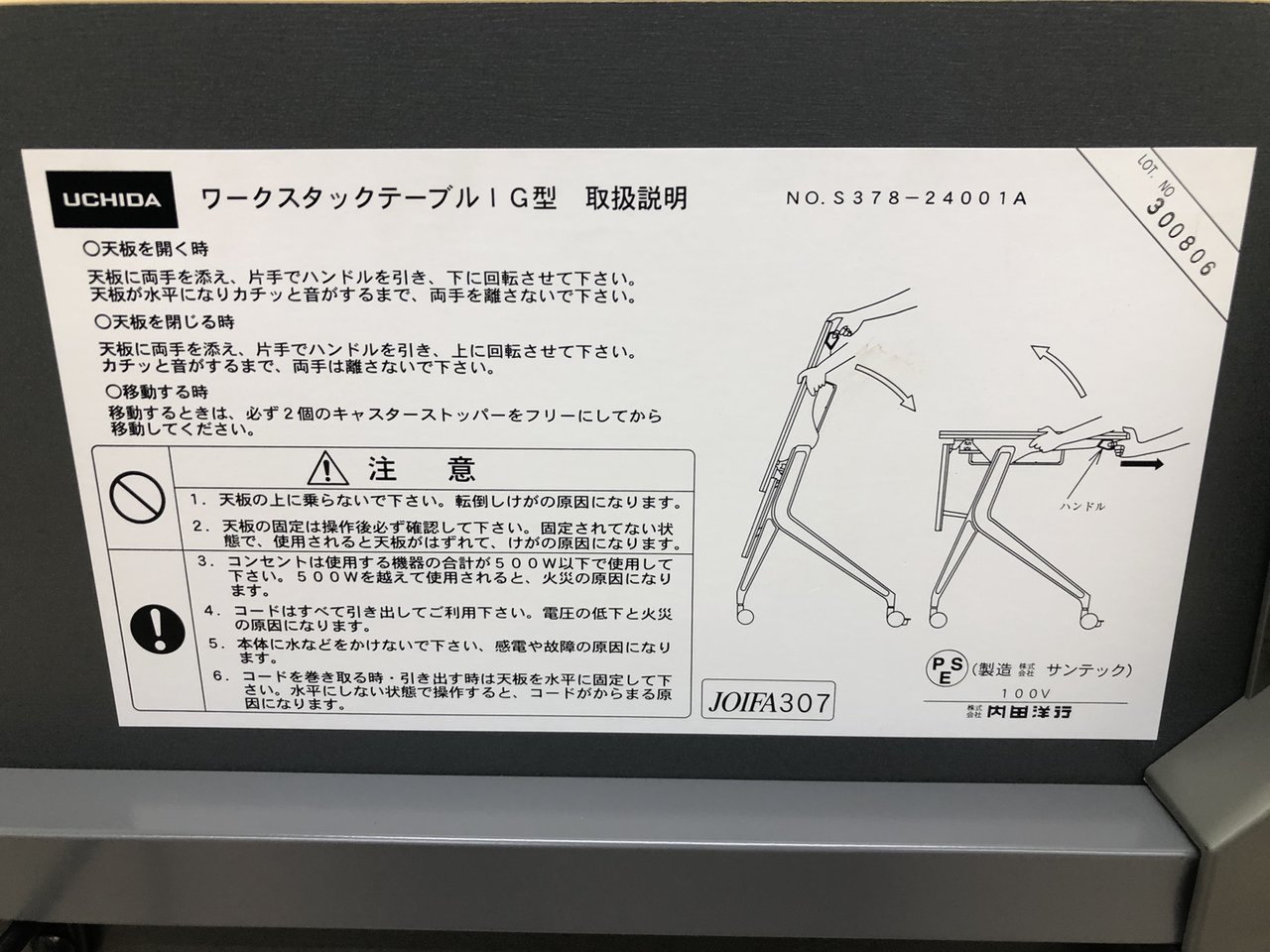 - 一部不具合あり天板歪み、アジャスター無し、キャスター使用不可ようなそのテーブルの本来の効用を果たすための機能以外の一部が使用不可な状態。(例、キャスターロッ ク機能使用不可、棚板無し等がある。)