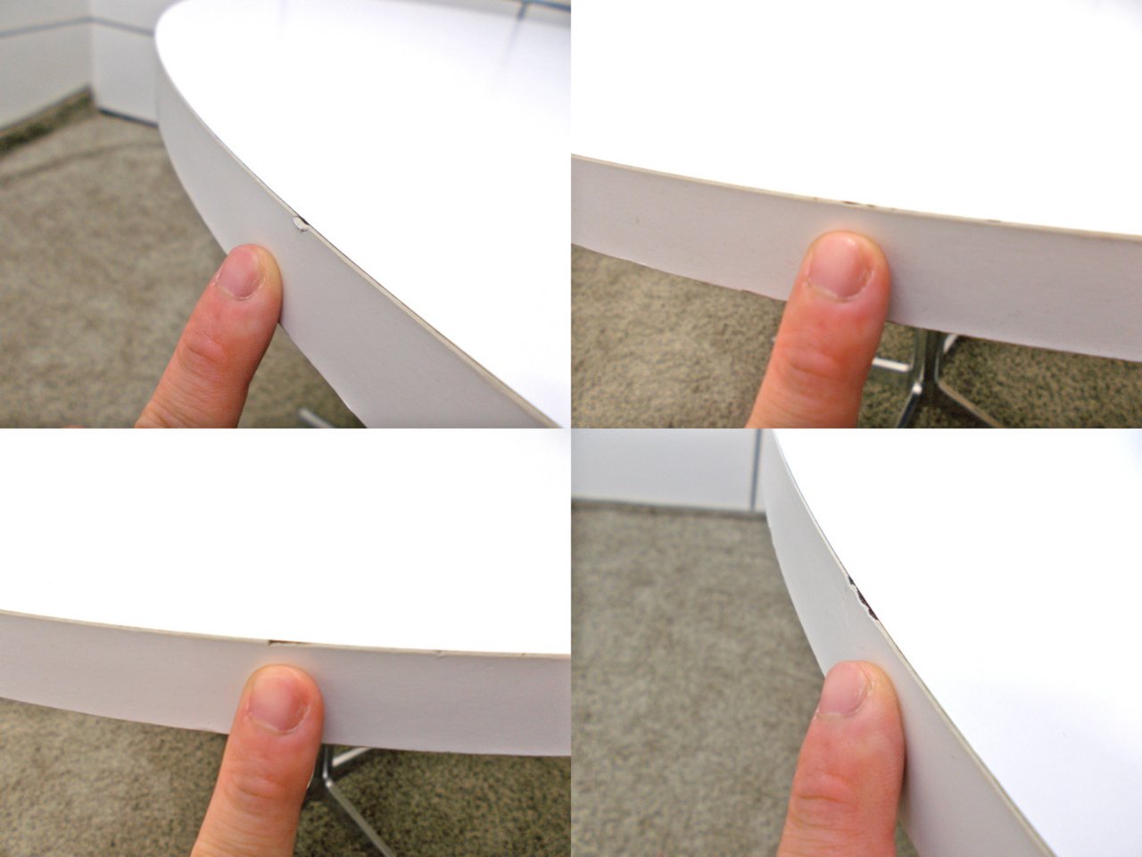 - 一部不具合あり天板歪み、アジャスター無し、キャスター使用不可ようなそのテーブルの本来の効用を果たすための機能以外の一部が使用不可な状態。(例、キャスターロッ ク機能使用不可、棚板無し等がある。)