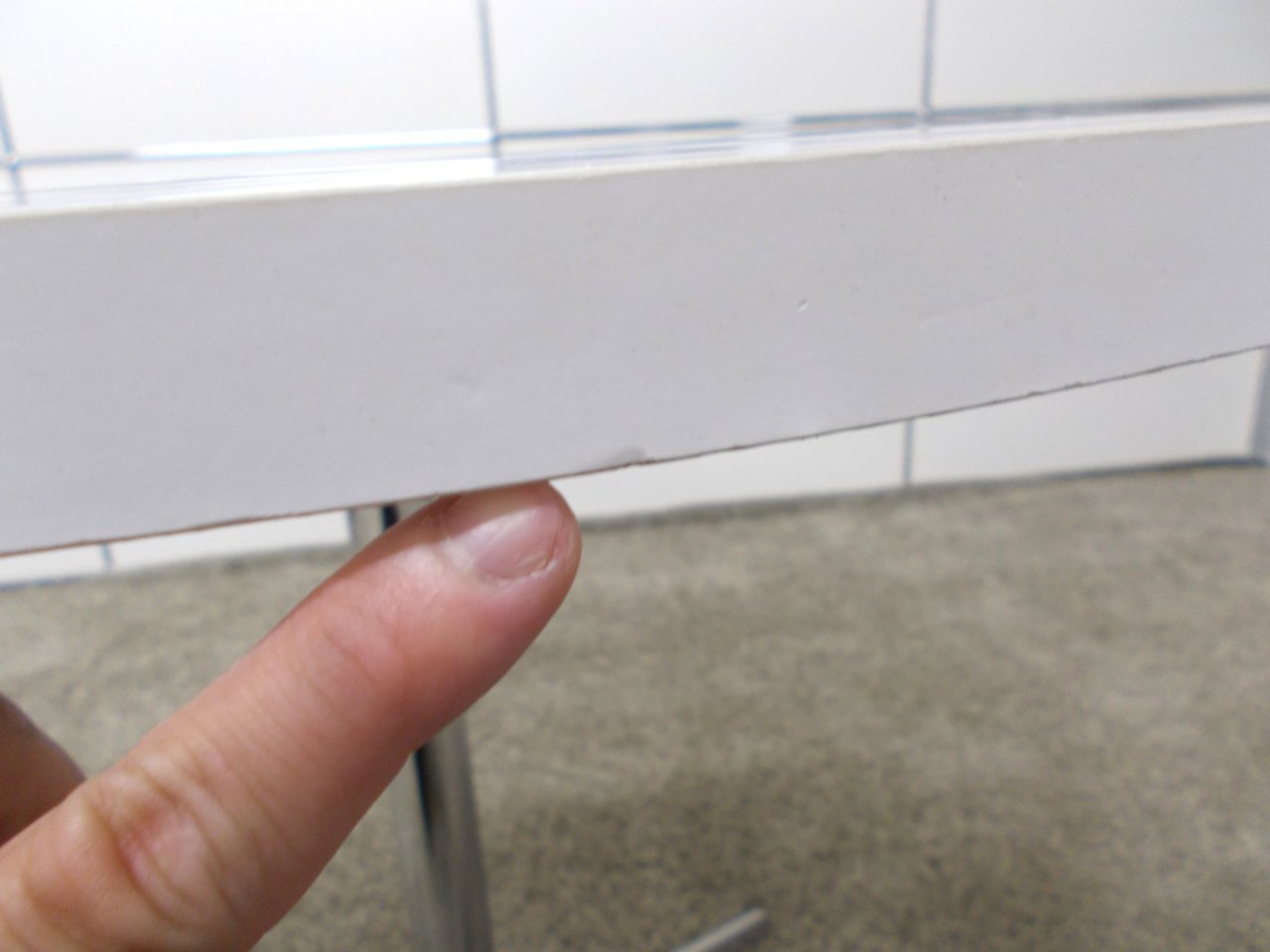 - かなり強い濃い黄ばみ・変色が商品全体にある。(例、天板、幕板、棚板、サイド部分、脚部等にある。)